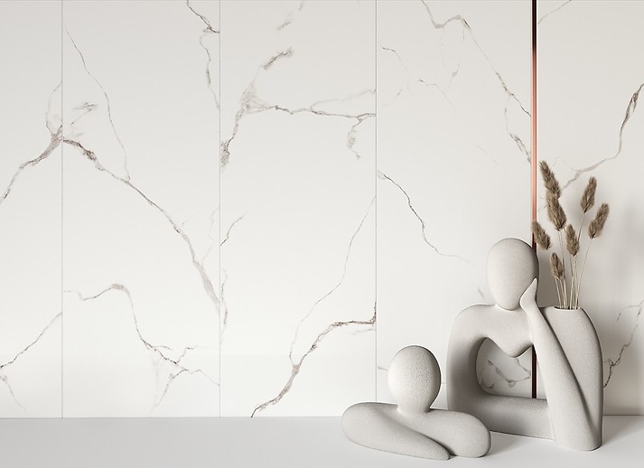 Kolekcja Side Calacatta wzoruje się na wykwintnym kamieniu Calacatta Quartz. We wnętrzu tworzy klimat ponadczasowej elegancji, odtwarzając głębie, połysk i użyłowienie marmuru. Nieliczne, jasnobrązowe żyłki, przypominające bieg rzeki, rozchodzą się harmonijnie po gładkiej powierzchni płytki, kreśląc niepowtarzalne wzory. Te płynne linie na jasnym tle sprowadzają do wnętrza poczucie przestronności i spokoju, a satynowe wykończenie płytek nadaje przestrzeni blasku. Ponadczasowe piękno ukryte w odsłonie Side Calacatta pozwala na realizację wyjątkowych projektów. Płytki o wzorze marmuru Side Calacatta spełnią oczekiwania miłośników minimalizmu, stylu glamour i skandynawskiego. Kolekcja jest na tyle wszechstronna, że w połączeniu z różnymi odcieniami i fakturami – płytkami strukturalnymi, drewnem czy metalem, tworzy luksusową i stylową przestrzeń.