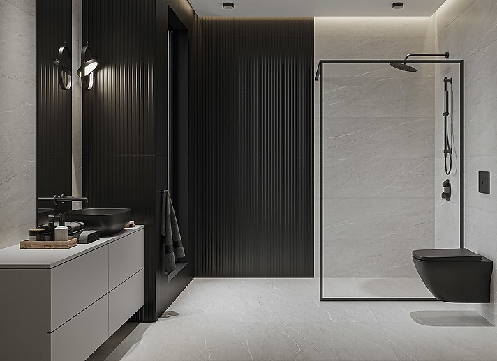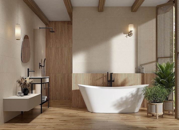 Mono look można łatwo odwrócić, zamieniając jednokolorowe wnętrze w miejsce pełne kontrastów. Płytki do łazienki Aurano w połączeniu z drewnopodobnymi panelami strukturalnymi przekształcą monochromatyczne wnętrze w nowoczesne spa w uspokajającym stylu japandi. Przytulną przestrzeń, w której dominują naturalne materiały – kamień i drewno oraz ciepłe beże i łagodne brązy, uzupełnią żywe rośliny w dekoracyjnych donicach, wnosząc do wnętrza kolor i podkreślając bliskość natury.