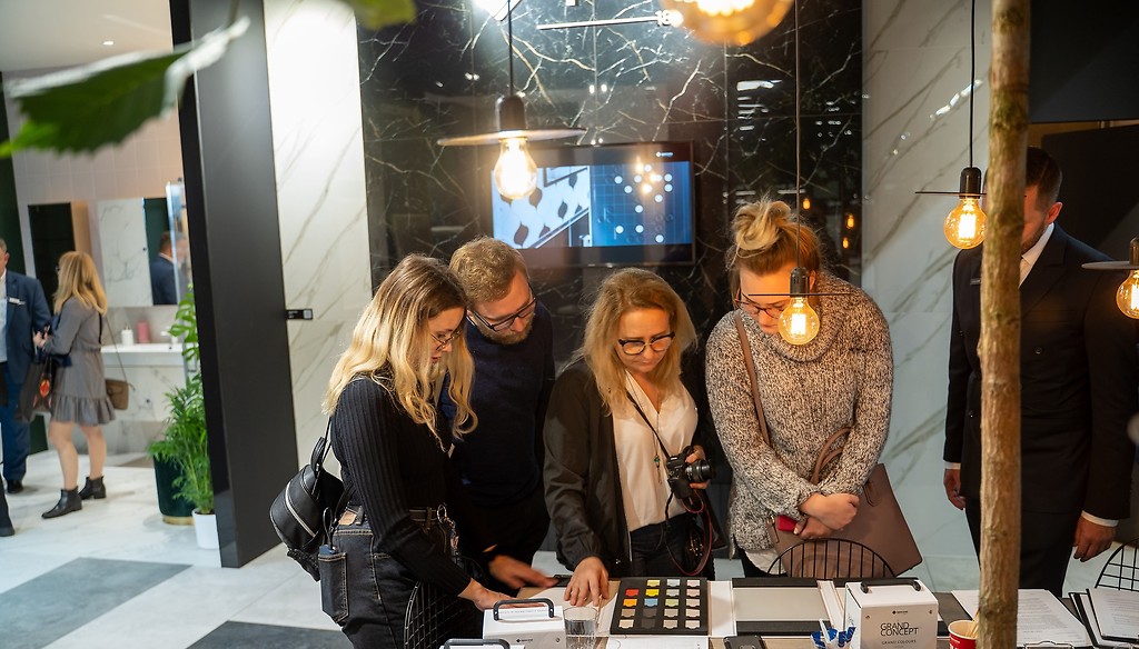 Strefa Spotkań została zaaranżowanej płytkami serii GRAND CONCEPT, w tym wyjątkową kolekcją inspirowaną marmurem CALACATTA GOLD – z unikalnym szarym i złotym użyłowieniem. Podziwiać można było też płytki ceramiczne odwzorowujące beton z kolekcji Quenos, które swoim rysunkiem i różnorodnością odcieni niepodzielnie rządzą obecnymi trendami.