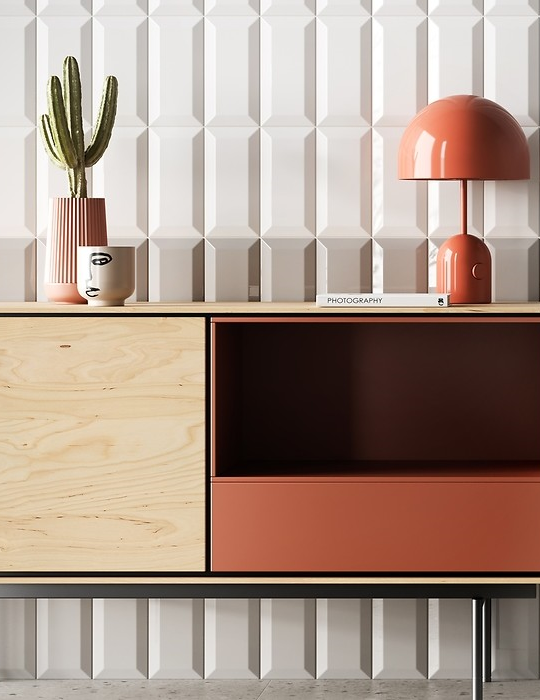 Cegła, zwłaszcza ta w kolorze białym, jest na tyle neutralna, że doskonale komponuje się z wieloma różnymi stylami i kontrastującymi odcieniami np. błękitem, szarością lub miętą, które ożywiają wnętrze. Białą cegłę można zestawić z ciemnymi elementami, tj. czarny blat lub z barwnymi roślinami doniczkowymi czy ozdobnymi koszami z wikliny. Na podłodze warto ułożyć ciepłe kolorystycznie panele, na przykład płytki ceramiczne z fakturą dębu z kolekcji PASSION OAK BEIGE.