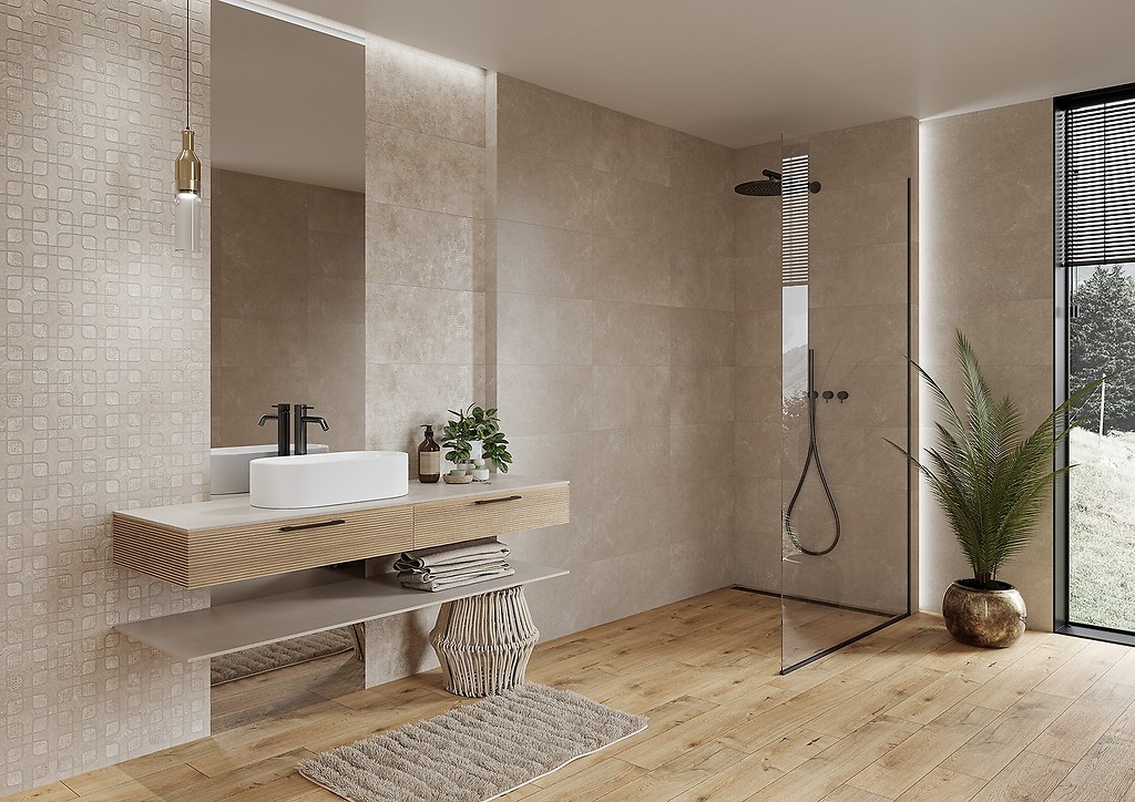 Beż staje się jednym z najpopularniejszych wyborów klientów — to kolor, który daje wrażenie przestrzeni, ciepła i spokoju, a jednocześnie świetnie łączy się z różnymi stylami aranżacji. W 2025 roku w wyszukiwaniach wyraźnie dominowały trzy beżowe kolekcje które łączy gładka płytka bazowa oraz płytka strukturalna, dając więcej możliwości w projektowaniu łazienki.