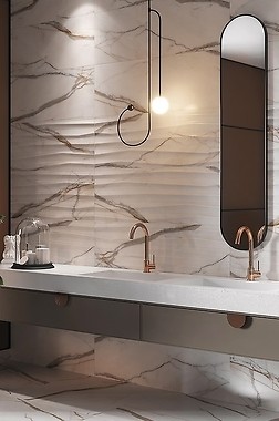 Osobom, które nie śledzą trendów wnętrzarskich, łazienka w beżach i brązach mogłaby się kojarzyć bardzo tradycyjnie. Zmieni się to, jeśli zobaczą te kolory w nowej odsłonie oraz w zestawieniu ze sprzętami o bardzo nowoczesnych, wręcz awangardowych formach. Znakomitym przykładem jest aranżacja z płytkami z kolekcji Opoczno Alcamo, prezentujących wzór jasnego, ale wyraziście użylonego kamienia. W widocznym tu wnętrzu projektanci połączyli je z płytkami drewnopodobnymi ze znanej nam już kolekcji Passion Oak, a następnie z ceramiką i armaturą o bardzo prostych, geometryzujących kształtach. Co za efekt!