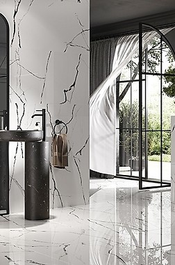 Na podłodze nie sprawdzi się biała fuga, ponieważ zabrudzi się błyskawicznie, co odbije się na estetyce posadzki, jak i całego wnętrza. Dlatego zalecane jest spionowanie płytek podłogowych zaprawami w odcieniach szarości. Chociaż i tu są wyjątki. Do takich należą płyty wielkoformatowe. Już same wymiary płyt (nawet 120x60 cm w przypadku serii Grand Concept Opoczno) sprawiają, że ilość kafli potrzebnych na wykonania posadzki w łazience czy aneksie kuchennych, a tym samych łączeń pomiędzy nimi jest niewielka. Dodatkowo, dzięki rektyfikowanym krawędziom płyt szerokość szczelin jest minimalna. Dlatego wybierając białe płyty wielkoformatowe na podłogę, na przykład z kolekcji Eternal, możemy zdecydowanie sięgnąć po białe fugi, które podkreślą efekt jednolitej powierzchni. Nie zakłócą także dominujące białego tła płytki ozdobionego rysunkiem kamienia z wyraźnymi czarnymi żyłami.
