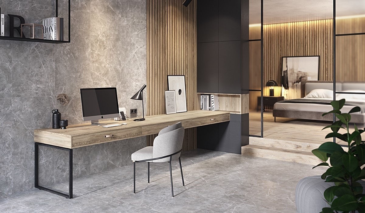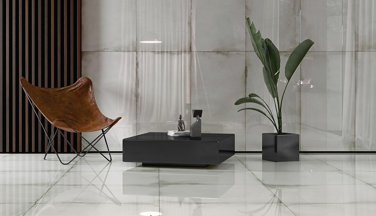 We wnętrzach z coraz większą odwagą wykorzystujemy takie materiały i faktury, które jeszcze do niedawna uważane były za mało atrakcyjne. Ukrywaliśmy je pod zdecydowanie bardziej kolorowym wykończeniem ścian. Wśród nich jest beton – szary, o nieregularnej strukturze, surowy i chłodny. Jeżeli nie wiesz, co na ścianie w salonie będzie ciekawym akcentem wizualnym, to decyduj się na wielkoformatowe płytki inspirowane naturalnym betonem, które przekonują swoją autentycznością, głębią i jednocześnie unikalną surowością. Przykładem jest OPTIMUM GRAPHITE, czyli ciemny beton, pięknie komponujący się ze złotymi dodatkami, zielenią roślin i prostymi, geometrycznymi meblami w czarnym kolorze. Skontrastuj go z ciepłem drewna na podłodze i frontach szafek oraz jasnymi abażurami lamp.