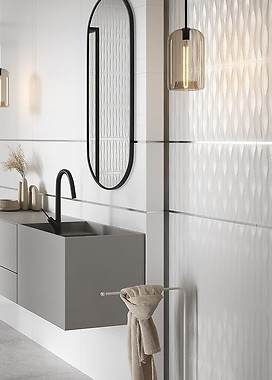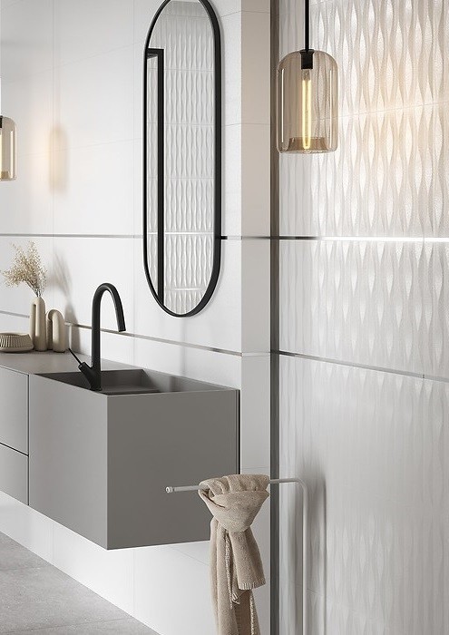 W przypadku pomieszczeń remontowanych, gdy skuwaliśmy stare płytki, nierówności będę znacznie większe. Trzeba je starannie zniwelować, zwłaszcza jeśli zamierzamy położyć płytki wielkoformatowe. W pierwszej kolejności należy pozbyć się pozostałości starego kleju oraz usunąć wszystkie luźne resztki tynku. Ubytki trzeba uzupełnić masą do ubytków, a w kolejnym kroku całość wyrównać zaprawą tynkarską, przy czym należy zadbać, aby uzyskana powierzchnia była równa, a kąty proste. Następnie należy ją zagruntować. Gdy powierzchnia ścian jest już równa, możemy przystąpić do wyboru płytek ceramicznych. Wielbiciele klasycznych rozwiązań mogą sięgnąć po ponadczasowe białe płytki do odnowionej łazienki. Warto jednak wybrać kolekcje, w których obok płytek gładkich występują te z oryginalnymi strukturami. Znajdziemy je m.in. w kolekcjach Parmina, Velez, Coffee Foam czy Ola Bianca. Remont kuchni natomiast to dobra okazji, aby ciekawie wykończyć ścianę nad blatem. Możemy wybrać ponadczasowe barwy ziemi na płytkach z kolekcji Argeo Touch lub zdecydować się na przyciągającą wzrok mozaikę z kolekcji Love You Navy White, w której elementy białe i drewnopodobne układają się w atrakcyjną jodełkę.