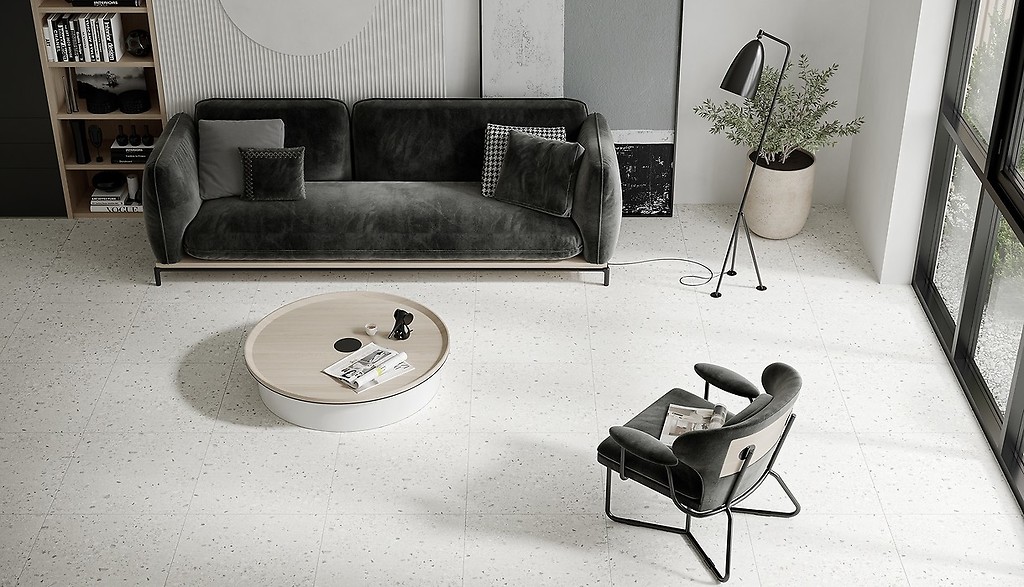 Szarość jako kolor uniwersalny dobrze komponuje się z różnymi wzorami i teksturami, w tym motywem z terrazzo. Szare drzwi o prostym, nowoczesnym designie będą subtelnie kontrastować z modnym motywem terrazzo i nie przytłoczą wzorzystej podłogi. Matowe, szare płytki z kolekcji Meet Me imitujące kamień terrazzo, stworzą spójną kompozycję z drzwiami o jasnoszarym odcieniu.