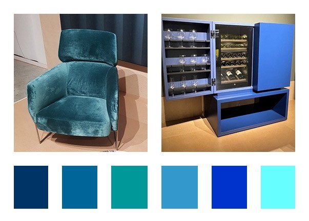 Na wielu stoiskach dominowały niebieskości z szeroką paletą odcieni - od ciemnego granatu, poprzez classic blue, kobalt, aż po turkus i miętę. Kolor ten królował przede wszystkim na meblach tapicerowanych, ale pojawiał się również na wybarwieniach drewnianych krzeseł czy frontach meblowych. Barwa pojawiała się też często na elementach dekoracyjnych.