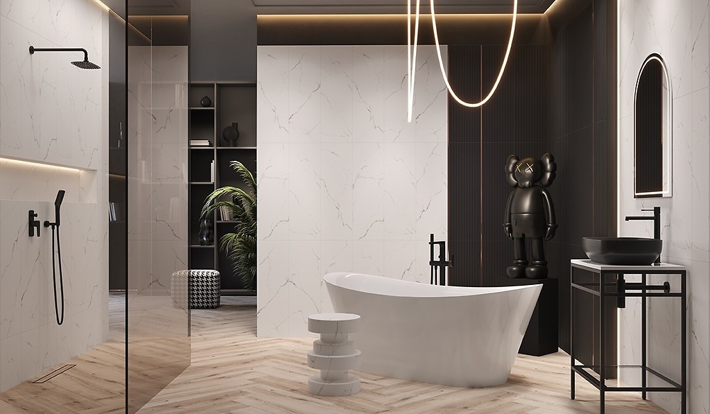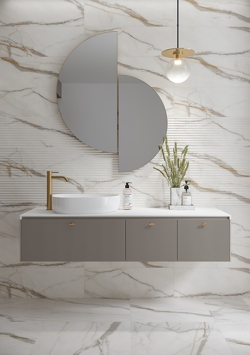 Kontrast w salonie to prosty i efektowny sposób na stworzenie przyciągającego wzrok, eleganckiego wnętrza. Ciemne meble na jasnej podłodze to wyraźne zestawienie, które sprawdzi się zarówno w nowoczesnych, jak i klasycznych aranżacjach. Płytki w białych, jasnoszarych i beżowych odcieniach rozjaśnią salon i można je zestawić z każdym intensywnym kolorem. Jasne płytki z połyskiem na podłodze lub ścianie w salonie, np. z kolekcji Calacatta Monet wzorowanej na białym marmurze, odbijając światło – optycznie powiększą naszą przestrzeń. Satynowa powierzchnia z delikatną grafiką jasnoszarych żył sprawi, że salon zyska ponadczasową elegancję, a wyjątkowe tło doskonale podkreśli piękno mebli.