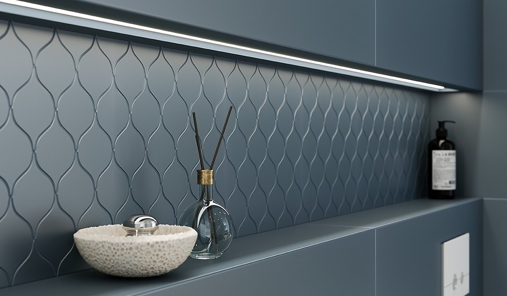 To najczęściej stosowane i najbardziej uniwersalne rozwiązanie. Nie sposób popełnić przy nim błędu, choć wariantów łączenia błękitu z bielą jest ogromnie dużo. A zatem jak urządzić łazienkę w kolorze błękitnym z dodatkiem bieli? Dziś mamy dwie wyjątkowe, niebanalne podpowiedzi. Bardzo nowoczesną propozycję podsuwa kolekcja Ocean Romance, na którą składają się białe i ciemnoniebieskie płytki gładkie oraz strukturalne. Te ostatnie mają wypukłą powierzchnię nawiązującą do oglądanej z wysoka falującej tafli oceanu. Uzupełnieniem aranżacji niebieskiej łazienki z bielą mogą być arabeskowe mozaiki w tych samych dwóch odcieniach do wyboru, odzwierciedlające rytm fal z kolei w wersji płaskiej.