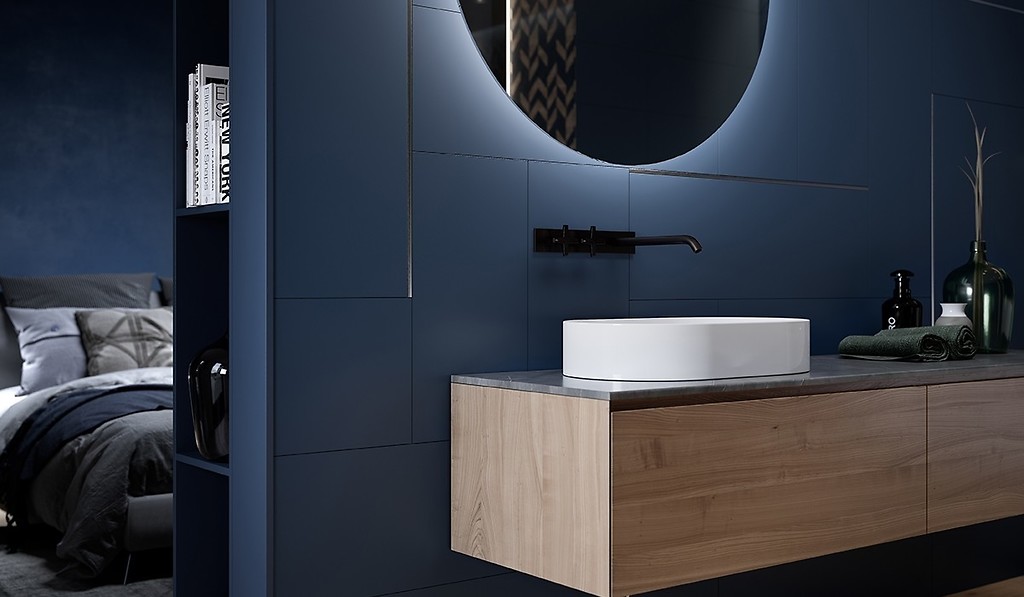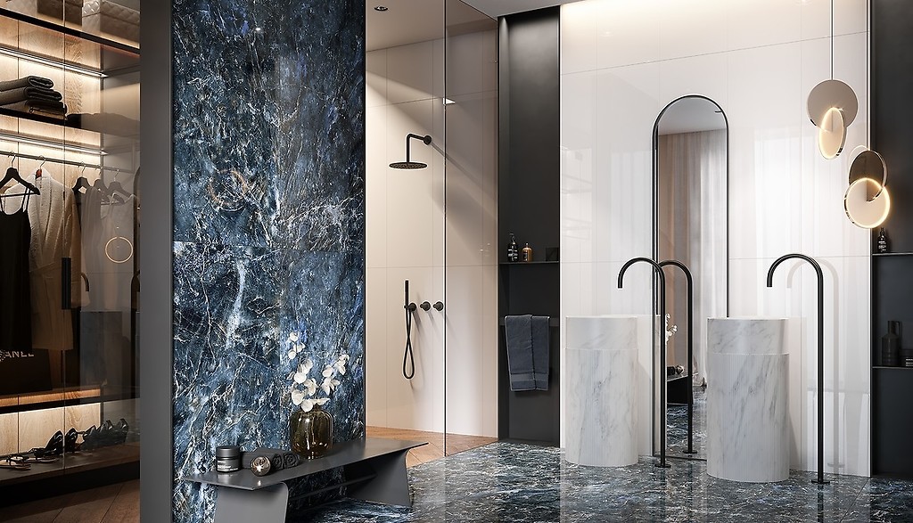 Na koniec propozycja wprost zjawiskowa, która codziennie będzie budzić fascynację domowników, a także zachwycać ich gości. To nagrodzona prestiżową Red Dot Award – nagrodą zwaną Oscarem Designu – kolekcja Color Crush. Na tle wielu tak modnych dziś wzorów kamienia, wyróżnia się unikatową inspiracją: wzorem labradorytu. Płynnie przeplatają się tu nasycone odcienie głębokiego granatu i ożywczego turkusu z białymi żyłami oraz akcentami brązu. Razem dają efekt trójwymiarowości i niesamowitej głębi, podkreślony jeszcze za sprawą polerowanej powierzchni. Niebieska łazienka z tym absolutnie wyjątkowym gresem, dostępnym w trzech formatach płyt ścienno-podłogowych, to gotowy przepis na unikatowe wnętrze. Dzień za dniem i rok za rokiem już na pierwszy rzut oka będzie olśniewać, a z bliska – intrygować detalami wzoru.