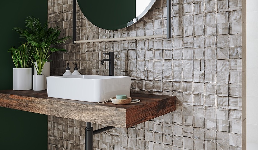 To kolejne tradycyjne, ale zawsze świeże połączenie, które jednocześnie daje ogromnie dużo możliwości. Kusi tym bardziej, że każdego dnia chce ożywiać wspomnienia z wypadów nad jezioro albo wyjazdów nad morze. Nasz pomysł na to, jak urządzić błękitną łazienkę ze wzorem drewna, to kolekcja Love You Navy Blue – marynistyczna klasyka w minimalistycznej interpretacji. Znajdziemy tu ciemnoniebieskie płytki gładkie i strukturalne z chevronowym tłoczeniem oraz dwa modele mozaiki o zmiennych proporcjach elementów niebieskich. Mozaiki te zostały zaprojektowane tak, by umożliwić kaskadowanie (zróżnicowanie zagęszczenia) wzoru na ścianach. Aby podłoga w niebieskiej łazience z drewnem podkreślała wakacyjne skojarzenia, warto, by na posadzce pojawiła się płytka ścienno-podłogowa Grand Wood Rustic Light Brown o wymiarach aż 20x120 cm, do złudzenia przypominająca deskę. Ten odcień jest idealnie zharmonizowany z kolekcją Love You Navy Blue, a wiele innych wariantów wzoru drewnianego łatwo znaleźć w rozbudowanym koncepcie Grand Wood.