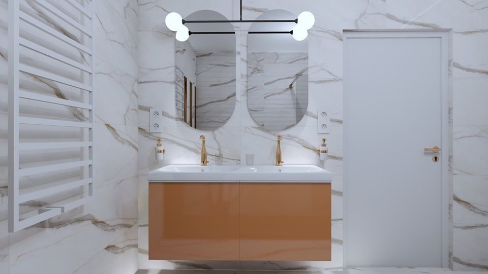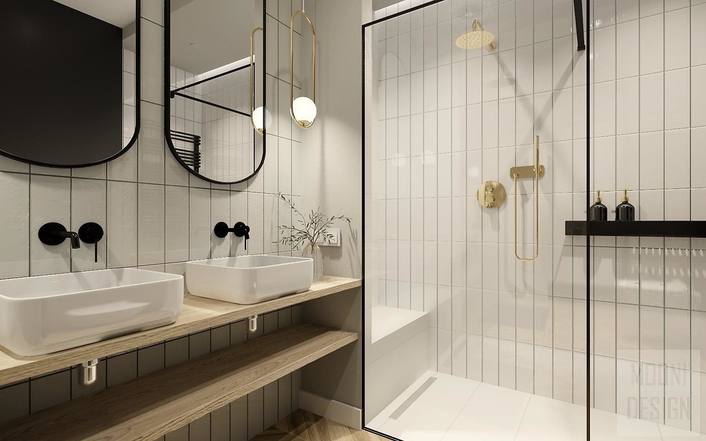 Cechą charakterystyczną stylu amerykańskiego jest duży metraż. Jak więc przemycić go do łazienki o niewielkich gabarytach? Sposób na to znaleźli projektanci z Mooni Design. W ich aranżacji znalazły się dwie umywalki, symetrycznie ulokowane oświetlenie i przestronny prysznic. Stylowym rozwiązaniem było także pionowe położenie płytek z kolekcji Salsa white glossy. Ważną role odegrała także delikatnie kontrastująca fuga oraz klasyczna podłoga ułożona z płytek Wood Chevron.