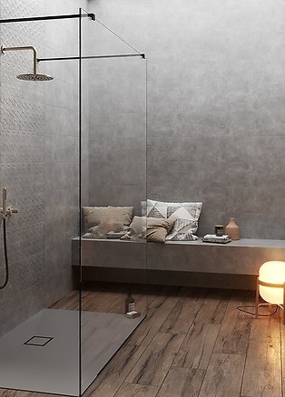 Kolekcja Noisy Grey pozwala z kolei sięgnąć po wątek kamienia – szarego z siatką cieniutkich, delikatnych białych żył. Do wyboru są tu płytki gładkie oraz drobno żłobione. Bardzo stylowo wyglądają zestawione z nierówną ścianą w odcieniu łososiowego różu. Jak poprzednio, tak i tu jest miejsce na meble w stylu vintage. Nie może też zabraknąć egzotycznej rośliny – im większej, tym lepszej.