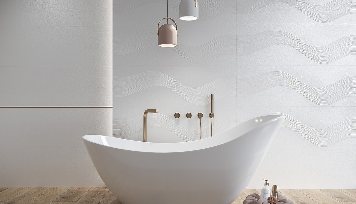 Styl boho, który zdobył serca wielu Polek i Polaków, to często tak naprawdę scandi boho – po skandynawsku pełne lekkości i prostoty. Operuje jasnymi kolorami, z bielą oraz odcieniami drewna na czele. Chętnie bawi się wzorami, ale nie popełnia szaleństw, jakie po kilku latach mogłyby się opatrzeć – zwłaszcza w łazience, gdzie większe zmiany wiązałyby się z poważnym remontem. Taką właśnie interesujące, ale ponadczasowe, bezpieczne i w gruncie rzeczy bardzo uniwersalne wnętrze w stylu boho pozwolą skomponować kolekcje takie jak Coffee Foam z białymi płytkami strukturalnymi ze wzorem stylizowanych fal. Co ważne, zdobienie to osiągnięto w technice mikrogranilii, w której matowa płaszczyzna z dekoracją widoczna jest pod idealne równą, przezroczystą powierzchnią. Jak widać w naszej aranżacji łazienki w stylu boho, Coffee Foam znakomicie łączy się z gładkimi płytkami w tym samym odcieniu bieli i z tym samym efektem mikrogranilii, a także z podłogowymi płytkami drewnopodobnymi.