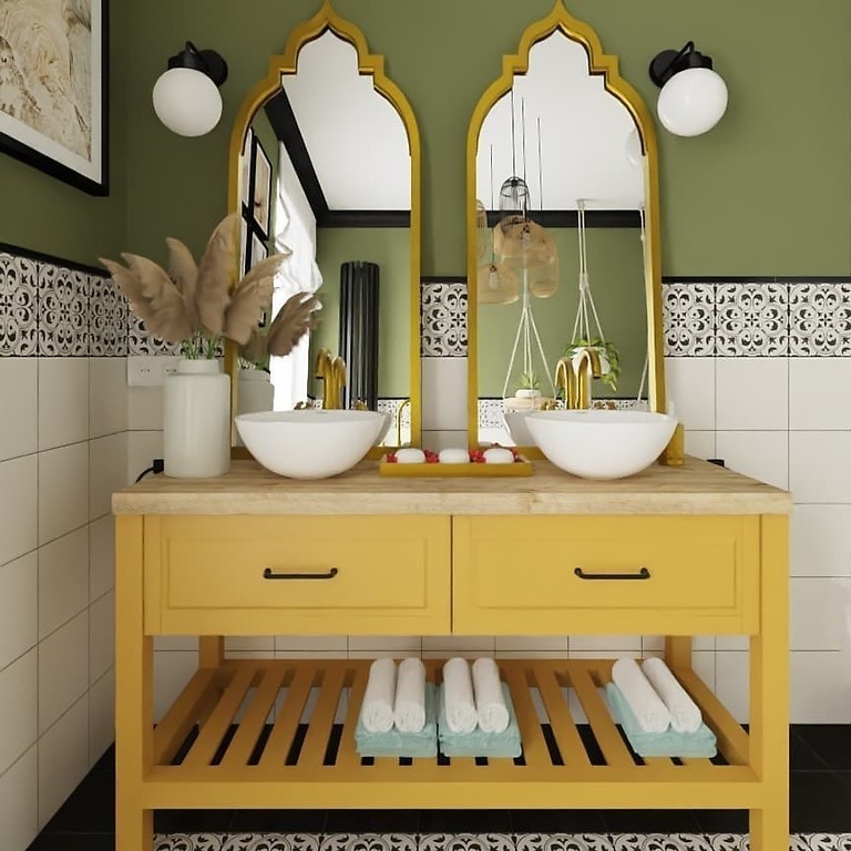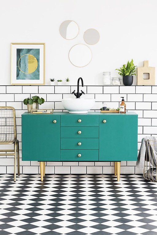 Drugi pomysł na łazienkę w stylu eklektycznym to podróż przez epoki. Niech wzornictwo sprzed stu i więcej lat spotka się ze współczesnym designem, geometria z formami organicznymi, tradycja z nowoczesnością, a nawet z futuryzmem. Jak rozplanować taką aranżację? Na zasadzie czytelnych przeciwstawień. Podłoga łazienki w stylu eklektycznym może przypominać taką ze starej kamienicy. W tej roli z powodzeniem wystąpią wzorzyste płytki podłogowe z kolekcji Patchwork – Clover Black Pattern, Clover Gray Pattern czy Vertigo. Pod sufitem z kolei niech zawiśnie awangardowa lampa, np. wijąca się niczym wąż albo lekka jak chmurka. Na ścianach powinny pojawić się wyraziste sztukaterie, ale pomalowane nie na biało, lecz na wyraziste, modne kolory – np. koralową czerwień, miętową zieleń, pudrowy róż. W takiej łazience w stylu eklektycznym nad kolorową umywalką z ceramiki lub żywicy epoksydowej może zawisnąć fazowane zwierciadło w złoconej ramie, a obok nad starą komodą – dobry współczesny plakat albo jeszcze lepiej abstrakcyjny akryl bez ramy. Przyda się też akcent modnego stylu vintage, czyli powojennego modernizmu, choćby stolik pomocniczy o trójkątnym blacie wspartym na skośnych nóżkach. Im bardziej różnorodny i kolorowy (także dosłownie) będzie ten koktajl, tym lepiej.