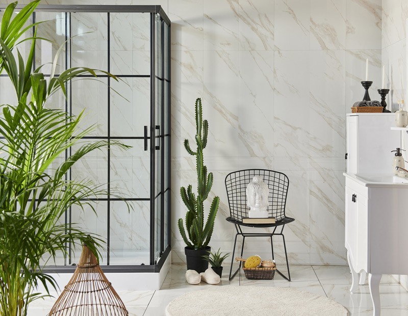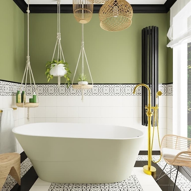 Łączenie skrajności, które stanowi istotę stylu eklektycznego, można rozwiązać także na innym poziomie – zamiast całego bogactwa kontrastujących elementów wybrać wyraziste zestawienie dwóch dużych zespołów. Wyobraźmy sobie wnętrze podzielone w połowie wysokości delikatnym fryzem, np. pasem sztukaterii. Dolna część pomieszczenia otrzyma szatę konsekwentnie klasyczną. Na ścianie – w zależności od indywidualnych preferencji – albo powściągliwy wzór marmuru (np. Calacatta Gold Polished), albo płytki metro, ale układane w szykowną jodełkę (np. Metro Style White) – mające w sobie coś ze stylu retro, jednak w świeżej odsłonie. Na tle posadzki układanej w skośną szachownicę z jaśniejszych i ciemniejszych płytek stylowo zaprezentuje się wanna na lwich łapach, umywalka wsparta na ceramicznym postumencie, komoda na giętych nóżkach. Tylko gdzie tu eklektyzm?