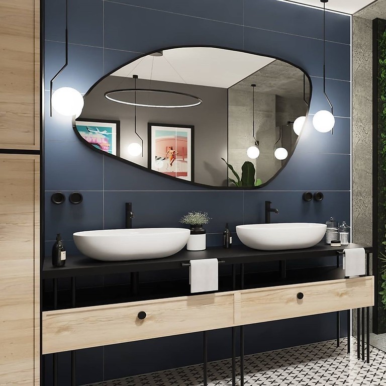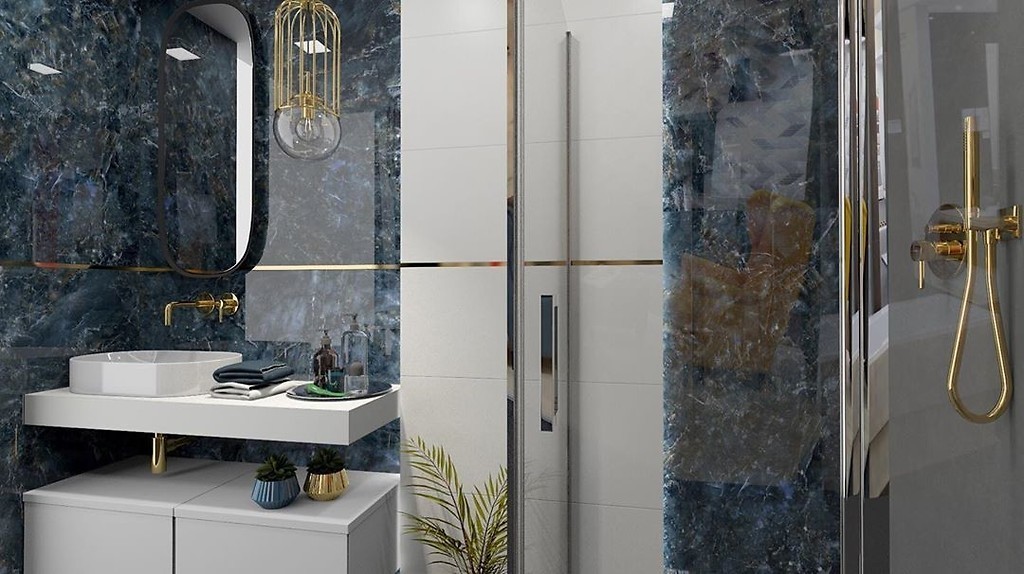 Skoro obecnie dominują w polskich mieszkaniach płytki jasne – sięgnijmy po ciemne. Nie neutralne w odbiorze, ale bardzo wyraziste, nawet zobowiązujące. Pozostałe elementy wykończeniowe oraz wyposażenie z kolei niech kontrastuje z nimi zarówno świetlistymi barwami, jak i prostotą formy. Na ściany, a może także na podłogę, proponujemy płytki Color Crush marki Opoczno w odcieniach granatu z przebłyskami turkusu i złota, zainspirowane labradorytem. Jest w nich coś ze scenografii teatralnej, niemało też z malarstwa barokowego. Dlatego ceramika powinna mieć jak najnowocześniejsze, nawet awangardowe formy, a armatura – proste kształty przełamane blaskiem złotem lub miedzi. W ten sposób powstanie łazienka eklektyczna jak z eleganckiego pisma o wnętrzach.