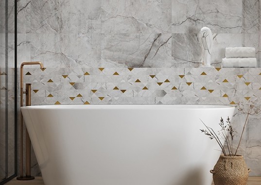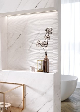 Jeżeli zależy nam, aby za wykreowanie wnętrza w duchu shabby chic odpowiadały głównie dodatki, a okładziny i wyposażenie zachowały oszczędny, nowoczesny charakter, zdecydujmy się na gładkie płytki w większym formacie. Dobrym wyborem będzie kolekcja Love You Navy white (30x90 cm) o satynowym wykończeniu. Przy tak stonowanym tle możemy wprost zaszaleć z dodatkami. Pasować będą zarówno akcesoria z ceramiki, ale także drewna. Suszone trawy w dzbanach oraz świece zapachowe w stylowych lampionach podkreślą klimat wnętrza. Dodając również mozaikę z tej kolekcji, łączącą elementy białe i drewnopodobne we wzór jodełki, możemy ciekawie wyznaczyć strefę, np. nad umywalką, stylistycznie nawiązując do drewna na podłodze. Idealnie pasować będą deski gresowe Love You Wood Satin lub Grand Wood Rustic Light Brown.