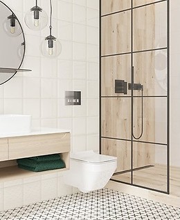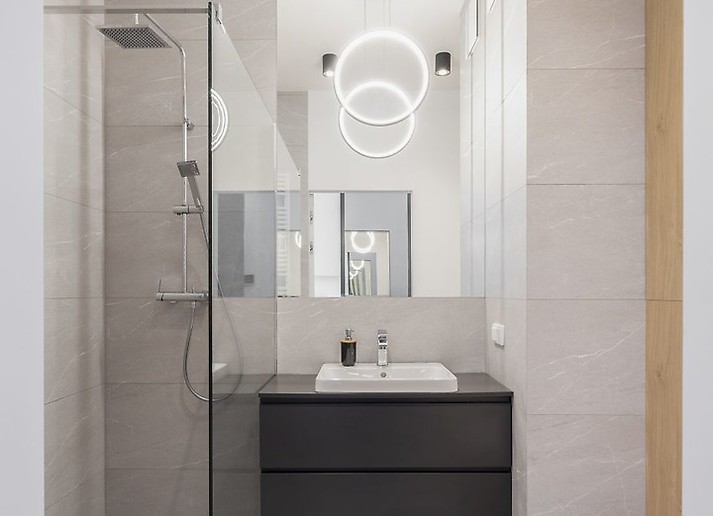 Płytki w łazience to także kolekcja Noisy Grey. Konsekwentnie, tu także zestawiłam je z drewnem. Chciałam, aby ten zabieg sprawiał, że całe mieszkanie będzie tworzyć stylistyczną i oryginalną całość. Ze względu na metraż zastosowałam kilka projektowych tricków, takich jak wykorzystanie przestrzeni nad obudową stelaża podtynkowego na szafkę, która dzięki ciągłości materiału będzie delikatnie ukryta, czy prysznic walk-in, wykończony płytką i oddzielony szklanym parawanem. Ważne były także praktyczne aspekty, dlatego lustro nad umywalką jest podniesione na wysokość płytki i pociągnięte aż do sufitu. Takie zabiegi powiększają optycznie nawet niewielką łazienkę.