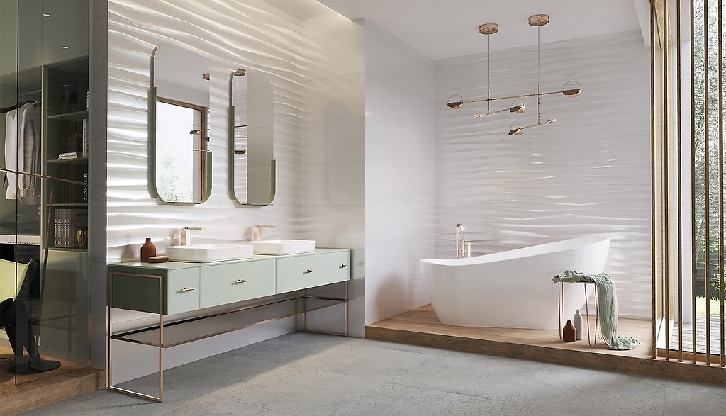 Biały kolor jest powszechnie stosowany w łazienkach, jednak coraz częściej uzupełniamy go o mocniejszy akcent kolorystyczny, pozbawiając go jego unikalnego uroku. Nowoczesne łazienki na poddaszu są często bardzo dobrze doświetlone przez połaciowe okna. Biel będzie w naturalnym świetle jeszcze bardziej rozjaśniona, co pozwoli nam stworzyć efektowną monochromatyczną stylizację o bardzo minimalistycznym charakterze. Na ścianach pojawić się mogą wielkoformatowe płytki marmur, z kolei na podłodze połyskujące gładkie kafelki w czystej bieli z delikatnymi czarnymi akcentami. Białej ceramice towarzyszyć będzie klasyczna armatura, podczas gdy białe szafki zamiast gładkich frontów, będą miały ozdobne frezowania i chromowane uchwyty. To bazowa stylizacja, o której nie warto zapominać, szczególnie jeżeli pomieszczenie jest małe, niskie czy też z dużą różnicą poziomów. Bielą łatwo jest przywrócić wnętrzu harmonijny kształt.
