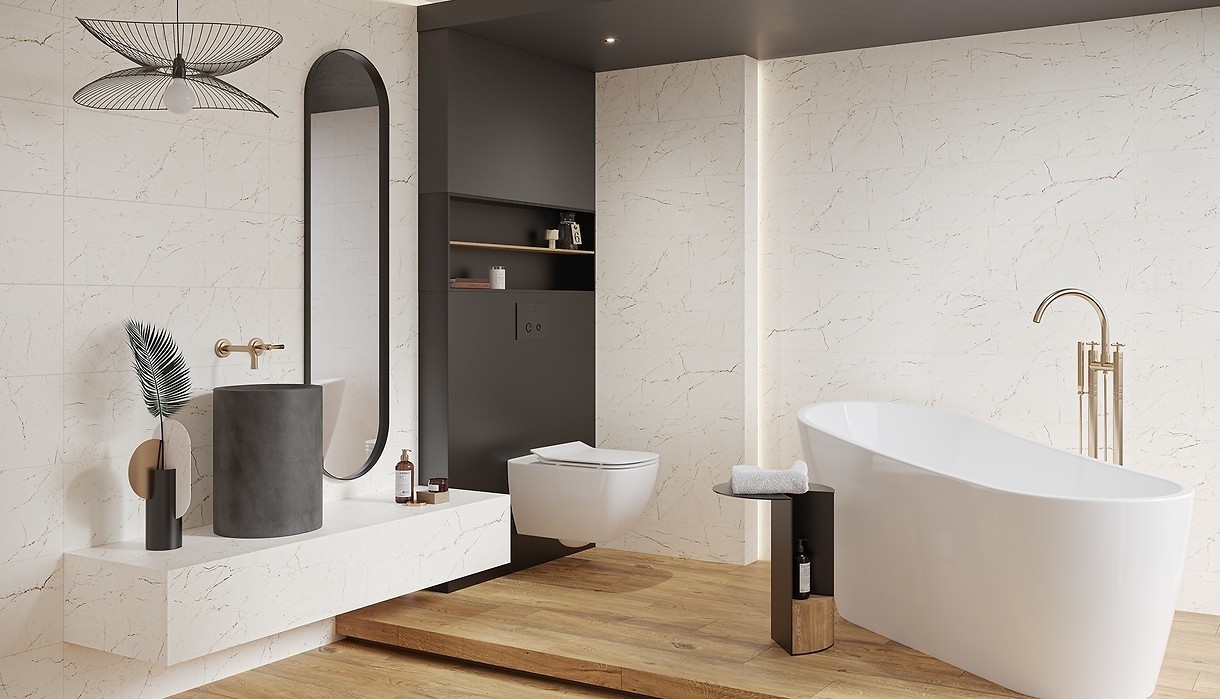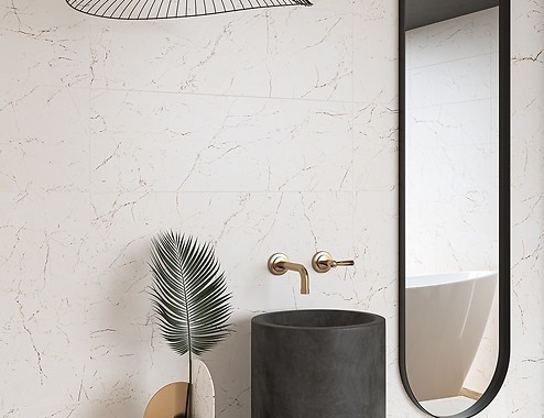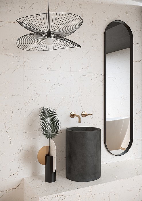 Małe mieszkanie może być piękne i nowoczesne. Wystarczy zastosować dobre rozwiązania i sprawdzone triki projektantów wnętrz. Przede wszystkim, na ile to możliwe, otwieramy przestrzeń dzienną. Nie dzielimy jej na mniejsze osobne pomieszczenia, ale wyodrębniamy strefy. Salon, kuchnia, a nawet przedpokój powinny stanowić połączoną przestrzeń bez klasycznych podziałów i granic. Dzięki temu małe mieszkanie będzie wygodne i przestronne. A jak urządzić małe mieszkanko, aby było dobrze zaprojektowane i efektowne? Nie musimy rezygnować z wymarzonego stylu czy kolorystyki, ale wprowadzajmy je z wyczuciem i zgodnie z wnętrzarskimi regułami. Mieszkanie będzie zachwycać aranżacyjną spójnością, jeżeli we wszystkich pomieszczeniach będzie przewijać się ta sama paleta barw i materiałów. Warto również zrezygnować z nagromadzenia elementów stricte dekoracyjnych, na rzecz materiałów wykończeniowych o atrakcyjnym wzornictwie, które ozdobią wnętrze. Elegancji doda małym pomieszczeniom ponadczasowy wzór kamienia naturalnego. W małej łazience urokliwe zaprezentują się płytki z kolekcji Alcamo, stanowiące nowoczesną interpretację rysunku jasnego kamienia. Grafika została opracowana tak, aby ten klasyczny wzór zachwycał także we wnętrzach o mniejszym metrażu. Płytki, których jasne tło przełamano delikatnymi żyłkami w odcieniach rudo-miedzianych będą znakomicie współgrały z popularną matową czernią jak i drewnem w ciepłym wybarwieniu. Wzór kamienia naturalnego jest na tyle uniwersalny, że może być wspólnym mianownikiem aranżacji wszystkich pomieszczeń. Doskonale zaprezentuje się na blacie w kuchni oraz w salonie jako dekor stolika kawowego.