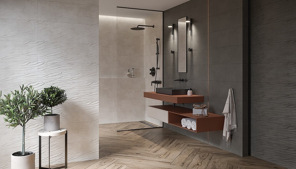Odpowiednio dobrane płytki pomogą też wizualnie skrócić zbyt długie pomieszczenie. Długa wąska łazienka z oknem i prysznicem na końcu aż prosi się o to, by po pierwsze ścianie na końcu nadać nieco ciemniejszy kolor od ścian bocznych, a po drugie strefę np. umywalki lub WC wyróżnić inną okładziną. Znakomite rozwiązania przynosi m.in. kolekcja Nerina Slash. Inspirowane betonem płytki dostępne są w trzech świetnie harmonizujących ze sobą odcieniach, które ponadto spotykają się w mozaikowym dekorze – wymarzonym w roli dekoracji ściany nad umywalką albo za WC.