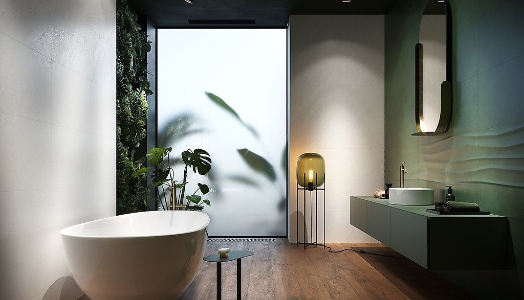 A jeśli dodatkowo długa wąska łazienka z oknem i prysznicem jest nadmiernie wysoka (jak zdarza się w tzw. starym budownictwie), dobrze jest ją wizualnie obniżyć. Pomoże w tym pas ciemniejszego koloru sięgający do ok. 1,5 metra nad podłogą. W tym miejscu możemy polecić serię Green Show. Dół wypełnią płytki w przyjemnym odcieniu zieleni (w wersji gładkiej oraz strukturalnej z motywem miękko układających się pasm), wyżej pojawią się te z bardzo delikatnym motywem liści w bieli i jasnej szarości.