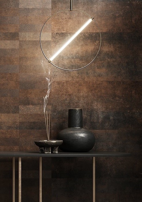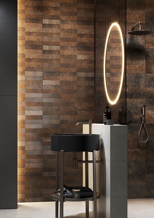 Po industrialne wykończenia imitujące beton, miedź, rdzawą blachę chętnie sięgamy urządzając domową łazienkę. Surowa loftowa stylistyka to jeden z najpopularniejszych kierunków aranżacji tej przestrzeni. Jak uzyskać efekt rdzy na ścianach, które będą stale narażone na działanie wody lub wilgoci? Idealnym rozwiązaniem są płytki ceramiczne. Grafika kolekcji Metaliko oddaje wygląd i fakturę rdzy. Kolekcję tworzy płytka gładka w głębokich odcieniach brązów i rudości oraz płytka dekoracyjna, dodatkowo ozdobiona delikatnym wzorem cegiełek. Dzięki zastosowaniu mikrogranili jej powierzchnia mieni się, wydobywając głębię koloru i wzoru. Płytki w praktycznym formacie 30x60 cm, sprawdzą się także w niewielkich łazienkach. Będę znakomitą bazą awangardowego wnętrza w industrialnym wydaniu. Całość świetnie uzupełni betonowa podłoga z gresów Durin oraz dodatki w barwach czerni, grafitu, chłodnej stali. Płytki z efektem rdzy, to sposób na wystrój łazienki, który przypadnie do gustu nie tylko zwolennikom wyrazistych aranżacji, ale także poszukującym sposobu na wykreowanie ciepłego, nastrojowego wnętrza z designerskim zacięciem.