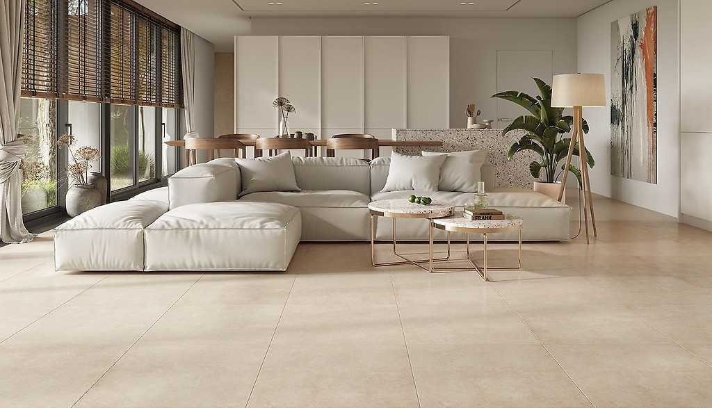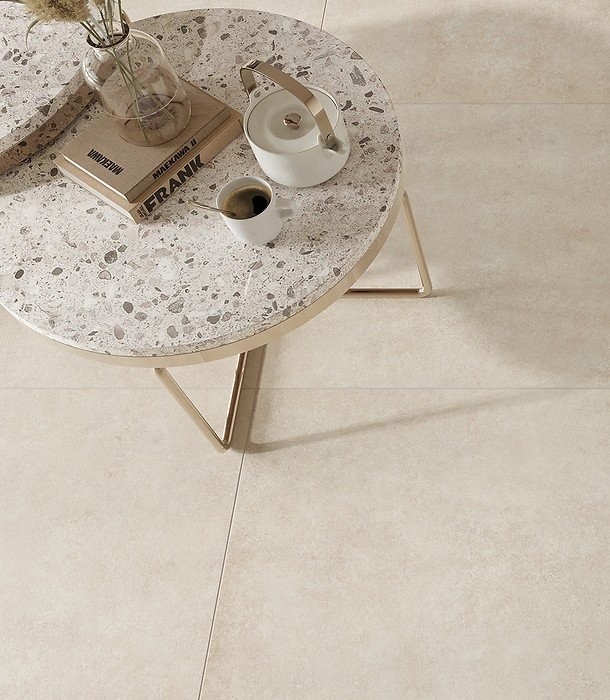 Jasne, betonowe podłogi wizualnie powiększają przestrzeń. Płytki odwzorowujące fakturę betonu wprowadzają do pomieszczenia nieco surowy, a jednocześnie elegancki i nowoczesny charakter. Beton kojarzy się ze stylem minimalistycznym i industrialnym. Jednak tworzy neutralne – szare lub beżowe tło, które doskonale eksponuje barwne i cieplejsze elementy wystroju takie jak drewniane meble, kolorowe tkaniny czy obrazy. Na przykład naturalna odsłona cementu z kolekcji TRIASSO cechuje delikatne, ciepłe tło, na którym świetnie zaprezentują się dodatki w stonowanych kolorach i o zróżnicowanej fakturze.
