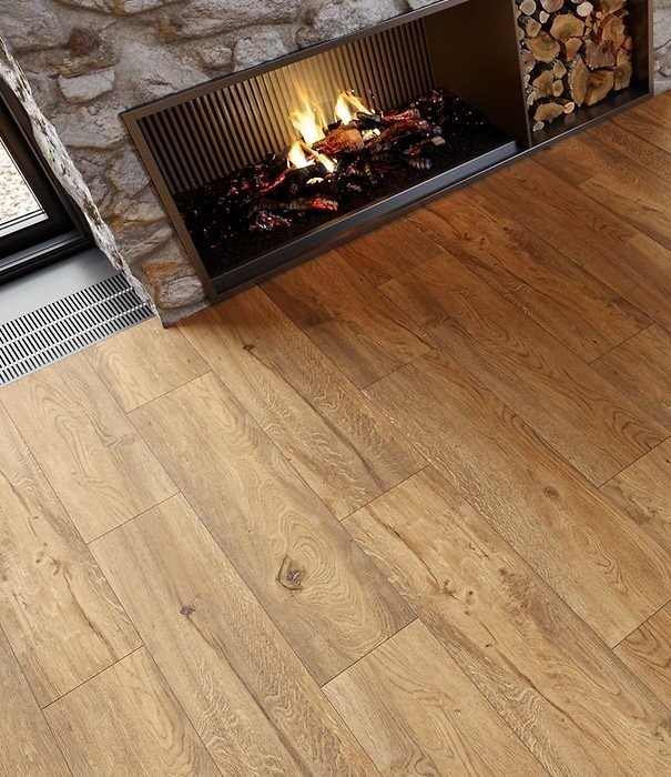 Podłogi wyłożone płytkami z naturalnym motywem jasnego drewna ocieplą i rozjaśnią wnętrze. Obecnie płytki z powodzeniem imitują różne rodzaje drewna – ciemny orzech, beżowe, brązowe odcienie dębu lub jasne sosnowe. Możemy je układać w różne wzory, takie jak jodełka oraz wybierać między różnymi odcieniami i fakturami, co pozwala osiągnąć zamierzony styl aranżacyjny. Płytki w jodełkę o fakturze jasnego drewna (np. z kolekcji Passion Oak Cream) sprawdzą się zarówno w klasycznych, jak i w nowoczesnych wnętrzach. Drewnopodobne gresy w ciepłej, kremowej kolorystyce z kolekcji Space Wood doskonale komponują się z większością kolorów i materiałów, przez co zaprojektowanie stylowego salonu jest niezwykle łatwe.