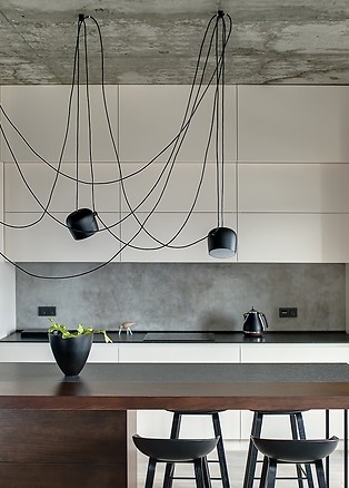 Co jednak pozostaje niezmienne, to staranność i powściągliwość w doborze wyposażenia, dużo przestrzeni i światła, pewien wizualny chłód. A przy tym coś z teatralnej zabawy techniką. Jak prowadzone po wierzchu rury, przewody wentylacyjne i kable. Włączniki światła i gniazdka naśladujące te z bakelitu lub porcelany. Lampy w formie reflektorów na długich przewodach – rozwieszone swobodnie, niby od niechcenia, na wkręconych w sufit lub ściany hakach.