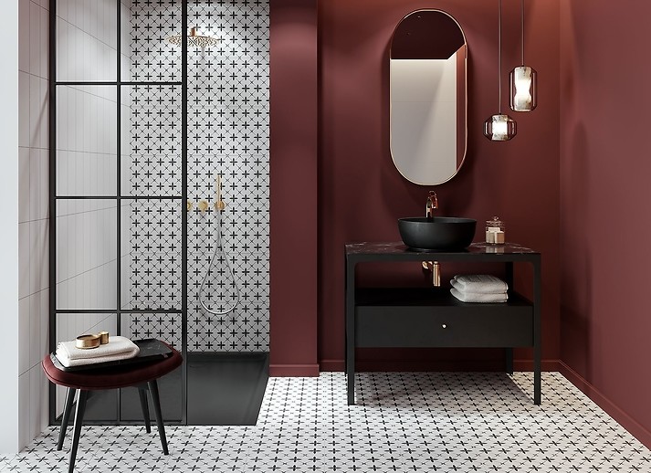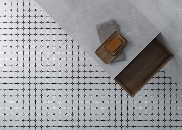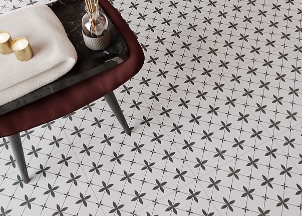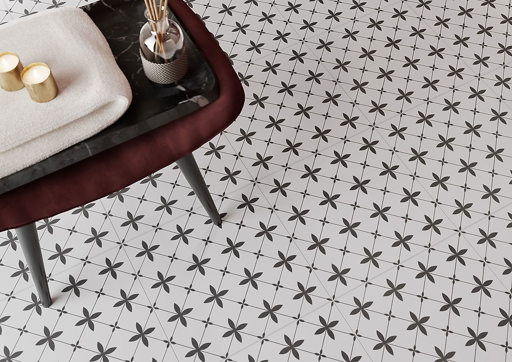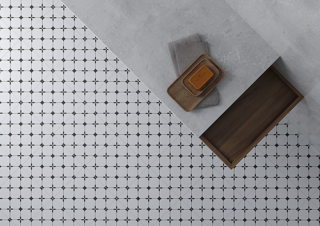 Każdy element wykończenia wnętrza wpływa na jego harmonię. Patchwork Clover może z sukcesem kreować nastrój pomieszczenia, zarówno w przypadku designerskiej łazienki, jak i stylowej kawiarni na starówce. Ten rytmiczny ornament to kwintesencja stylu vintage. Wyróżnia go prosty w formie wzór czarnych koniczyn, regularnie przeplatających się na strukturze siatki. Płytki będą znakomitą bazą dla wszystkich aranżacji w konwencji black & white. Dzięki klasycznej kolorystyce, stworzą zgraną kompozycję z intensywnymi barwami burgundu czy butelkowej zieleni. Zestawione ze stonowaną, matową czernią czy szlachetnym wzorem marmuru, będą nadawać wnętrzu nowojorskiego szyku.