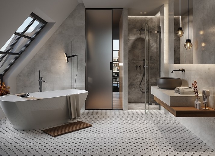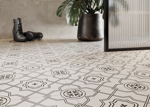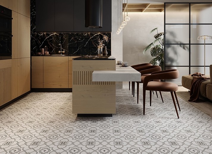 W każdym wnętrzu potrzebna jest odrobina fantazji. Urządzając stylową przestrzeń, zacznijmy od podstaw. Patchwork Sentima to pełna wdzięku czarno-biała grafika. Ten tak subtelny, a jednocześnie ekspresyjny wzór ma uniwersalne walory. Płytki dobrze odnajdą się w softloftowej łazience ułożone na podłodze oraz jako akcent pomiędzy szafkami w kuchni, nadając jej klimat vintage. Patchwork Sentima połączony z drewnopodobnym gresem świetnie sprawdzi się też w holu. Od progu będzie zapraszał do nastrojowego wnętrza, w którym liczy się kreatywność.