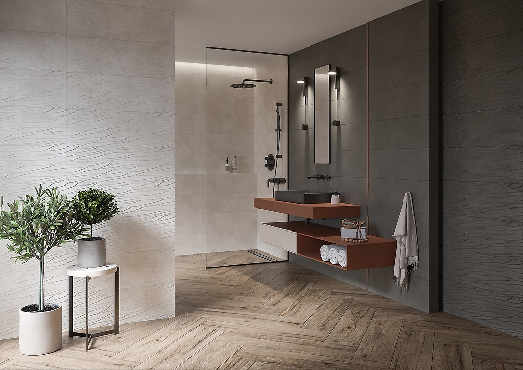 Drewnopodobne gresy z kolekcji Passion Oak w formacie desek (15x90 i 22x90 cm), oddające rysunek oraz fakturę drewna, to propozycja dla miłośników jodełki angielskiej. Zasadą jest łączenie elementów pod kątem prostym (krótsza krawędź styka się z dłuższą krawędzią sąsiedniej deski). W łazience w stylu klasycznym taka podłoga będzie prezentować się fenomenalnie, zwłaszcza w połączeniu z płytkami ściennymi o wzorze kamienia. W tej roli sprawdzi się kolekcja Santis o mocnym, eleganckim rysunku. Dobrym uzupełnieniem będą sztukaterie, złote listwy oraz motyw betonu. Mając taki zestaw, możemy cieszyć się luksusem rodem ze stylowych apartamentów. Zwolennicy minimalizmu mogą z powodzeniem połączyć płytki w jodełkę Passion Oak Cold Beige ze ściennymi płytkami Manuka. Proste formy wyposażenia, dodatki w matowej czerni, a do tego miedziana listwa przełamująca surowy charakter betonowej ściany, to gotowy przepis na łazienkę w stylu soft loft.