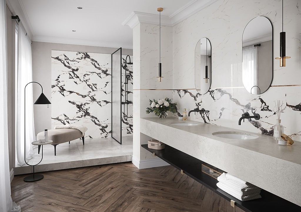 Klasyczny styl i elegancję salonów z podłogą w jodełkę francuską możemy również odtworzyć w aranżacji łazienek, co ułatwi kolekcja Wood Chevron. To zaskakująca i niezwykle urocza interpretacja parkietu. Płytki są praktyczne, a przy tym zachowują estetyczne walory drewna: kolor, rysunek, usłojenie. Ich wzór imituje ukośnie ułożone deski, dzięki czemu deseń uzyskamy układając płytki w tradycyjny sposób, równolegle względem siebie. Wystarczy zestawić płytkę Chevron A z płytką Chevron B, aby wzór łącząc się tworzył charakterystyczną strzałkę. Stonowany odcień i wyrazisty rysunek drewna zapewnią wnętrzu szczególny urok. Możemy uczynić z nich bazę aranżacji łazienki w stylu glamour. Białe płytki marmurowe Carrara Chic (w tym samym formacie 30x90 cm) na ścianie stworzą z nimi wyjątkowe zestawienie. Subtelny rysunek oraz błyszczące wykończenie to kwintesencja ponadczasowej elegancji. Efekt paryskiego szyku zapewnią płytki o wzorze kamienia wzbogacone dekoracyjną strukturą jodełki węgierskiej, które stanowią dodatkowy atut tej kolekcji. Zastosowane z umiarem, na wybranych fragmentach ścian, wyznaczą miejsce na szkatułkę z biżuterią, flakon perfum czy świece. W takim wnętrzu nie może zabraknąć wanny wolnostojącej, gustownej toaletki i efektownego mebla do siedzenia oraz dodatków w kolorze złota. Podłoga z płytek Chevron, to także punkt wyjścia do aranżacji łazienki w stylu nowoczesnej elegancji. Całości dopełnią szykowne formy wyposażenia: wanna o smukłej linii, biżuteryjna armatura w złotym wykończeniu oraz oryginalna konsola podumywalkowa.
