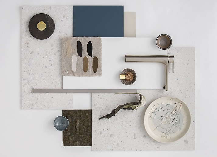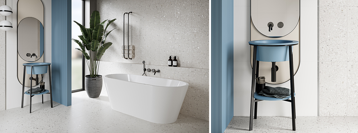 Nieoczekiwanie spotkanie może być początkiem wspaniałej przygody. Wzór płytek z kolekcji Meet Me nawiązuje do efektownego terazzo. Rozsypane drobne kamyczki zatopione w ceramicznej masie to punkt wyjścia dla ciekawych projektów łazienek. Znakomicie sprawdzą się jako baza wnętrza w stylu loft, jeśli wprowadzimy do aranżacji industrialne akcenty w postaci czerni oraz kroplę koloru niebieskiego. Stonowana kolorystyka płytek sprawia, że to dodatki zdecydują o charakterze wnętrza. Zobacz nasze inspiracyjne material boardy i sprawdź w jaki sposób wykorzystać potencjał Meet Me w Twojej łazience. Jedna kolekcja – trzy różne pomysły na wnętrze.