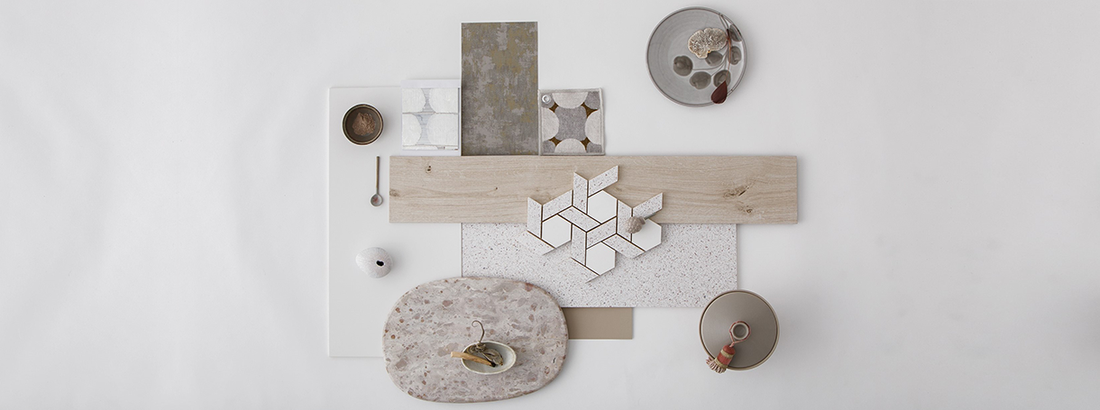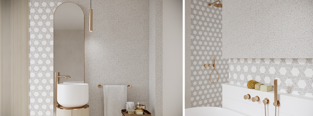 W kreowaniu swojej przestrzeni podążajmy za marzeniami. Kolekcja Wilmi z motywem terazzo idealnie podkreśli romantyczny klimat wnętrza z francuską nutą. Głównym motywem jest wzór drobnych kamyków, a oryginalności kolekcji dodaje nowoczesna heksagonalna mozaika łącząca biel i terazzo. Całość uzupełnia gładka biała płytka, co w rezultacie daje swobodę tworzenia wyjątkowych kompozycji. Baza w odcieniach beżu znakomicie zgra się z dodatkami w kolorze złota oraz rozbielonym drewnem. Ale możliwości jest znacznie więcej – sprawdź nasze material boardy i odkryj swoje wymarzone połączenie z płytkami Wilmi. Jedna kolekcja w trzech różnych stylizacjach.