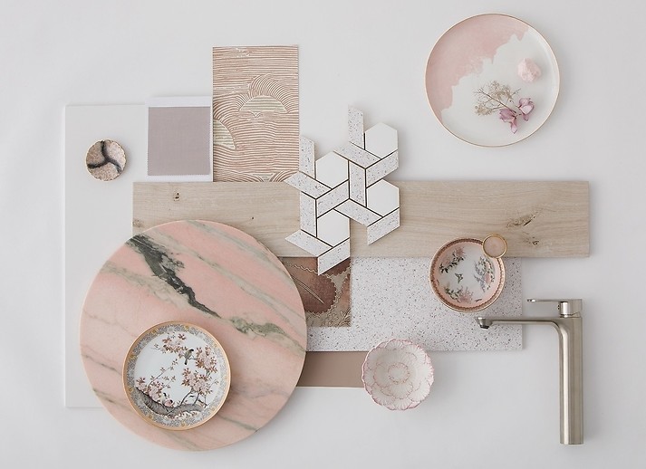 Biel i kremowe terazzo oraz rozbielone drewno, tworzące kolekcję Wilmi to znakomity punkt wyjścia do aranżacji łazienki glamour w subtelnym wydaniu. Zastosuj kolory z palety delikatnych pudrowo-różowych odcieni. Wprowadź florystyczne desenie: drobne kwiatowe wzory w dodatkach będę ciekawie korespondowały z drobinkami terazzo. Okładziny świetnie uzupełni tapeta o strukturze jedwabiu z wzorem przypominającym tkaniny na kimono lub welurowa tkanina z większym kwiatowym wzorem. Dyskretne, ale szlachetne dodatki to klucz do udanej aranżacji. Efektownie zaprezentuje się różowy marmur z wyraźną kontrastową żyłą czy uchwyt meblowy z różowego kwarcu z delikatną złotą obwódką. Pasujący kolor armatury to nikiel. W taki wykończeniu powinny być także inne metaliczne elementy, np. oprawy lamp, profile kabiny prysznicowej.