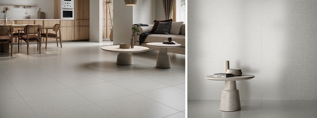 Grafika płytek Shallow Sea odwołuje się do estetyki kamienia typu terazzo. Kolekcja utrzymana jest w jasnych odcieniach szarości. Przywodzi na myśl wakacyjną aurę i uczucie łaskotania drobnego piasku pod stopami. Czasem pojawi się większy żwirowy kamyk, a czasem na powierzchni – dzięki jej wybłyszczeniu, odbije się promień słońca. Matowe wykończenie w wersji soft mat sprawia przy tym, że w dotyku gres jest przyjemnie miękki.