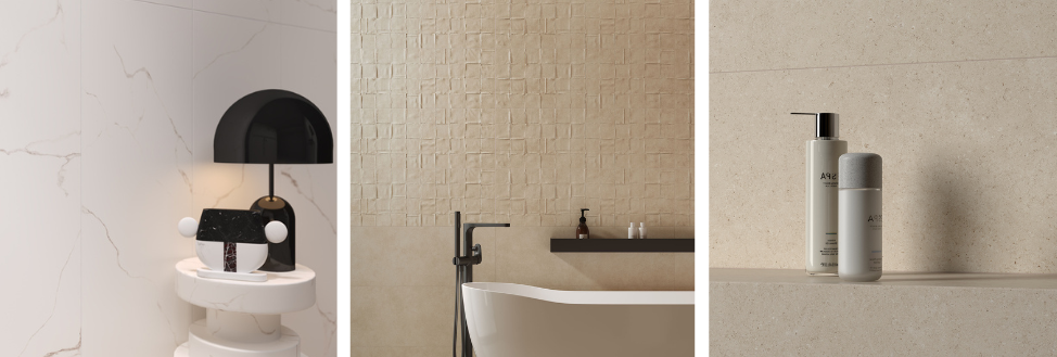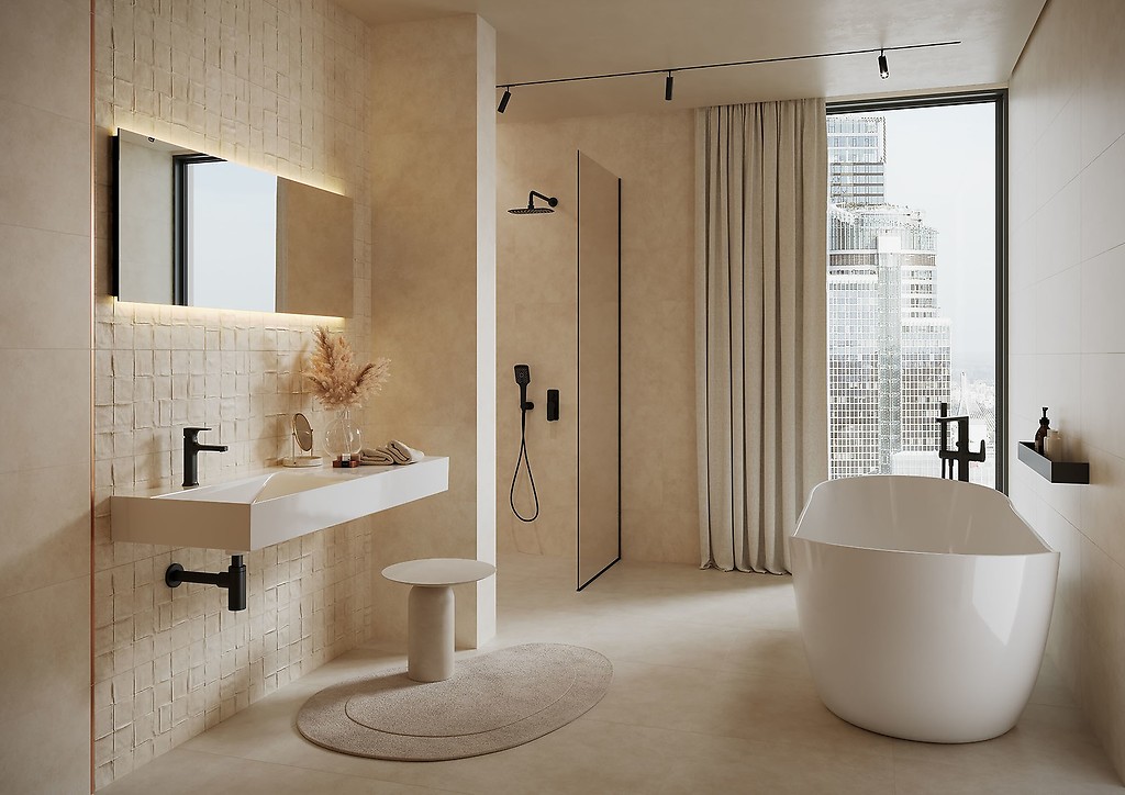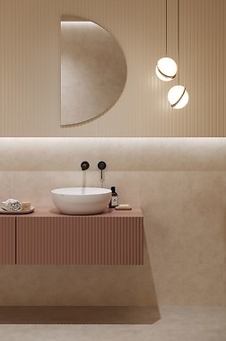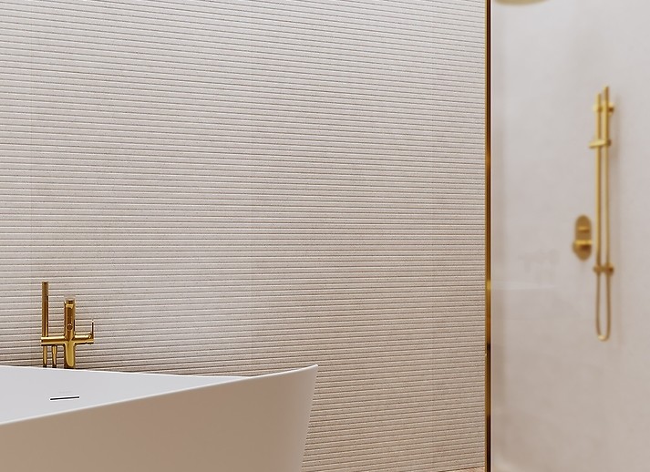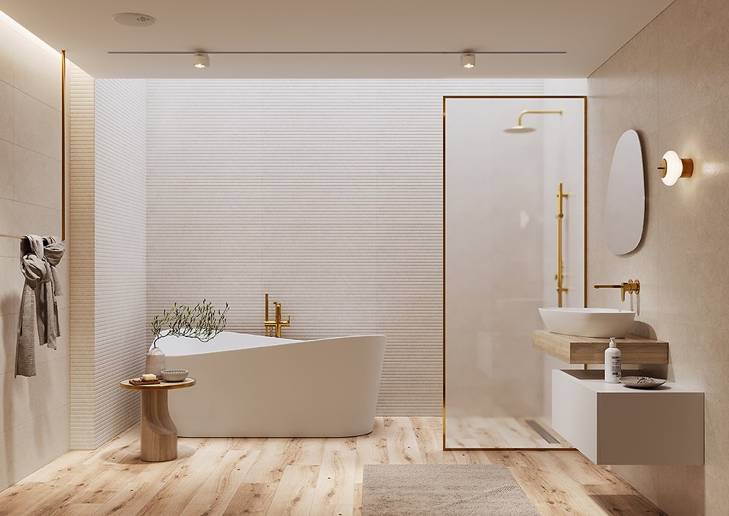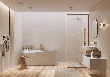 Mono look można łatwo odwrócić, zamieniając jednokolorowe wnętrze w miejsce pełne kontrastów. Płytki Aurano w połączeniu z drewnopodobnymi panelami strukturalnymi przekształcą monochromatyczną łazienkę w nowoczesne spa w uspokajającym stylu japandi. Przytulną przestrzeń, w której dominują naturalne materiały – kamień i drewno oraz ciepłe beże i łagodne brązy, uzupełnią żywe rośliny w dekoracyjnych donicach, wnosząc do wnętrza kolor i podkreślając bliskość natury.