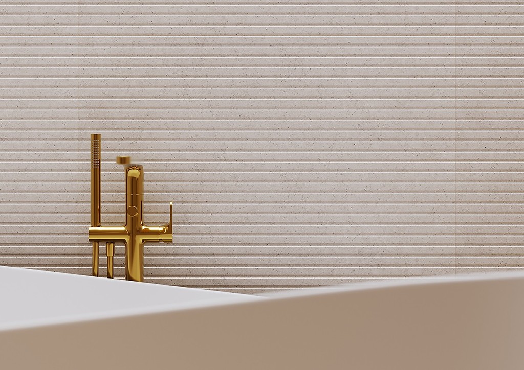 AURANO to kolekcja stworzona na bazie ponadczasowego kamienia Aurisina Fiorita pochodzącego z Włoch. Na beżowej powierzchni płytki widoczny jest drobnoziarnisty deseń w jasnym odcieniu brązu, który układa się w subtelny wzór. Duże, gładkie kafle bazowe uzupełnione o płytki strukturalne w tym samym odcieniu i formacie, stworzą przestrzeń monochromatyczną z neutralnym, matowym tłem.