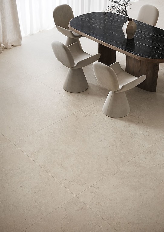 MARANTE to kolekcja, która uchwyciła jeden z najważniejszych trendów – subtelne, „chmurowe” kamienie, tworzące spokojne i ponadczasowe tło dla wnętrz. Jej powierzchnia przypomina delikatną mgłę, ozdobioną drobnymi inkluzjami i subtelnymi żyłkami. Dzięki temu płytki tworzą spójny, jednolity efekt, doskonały do aranżacji monochromatycznych. Paleta kolorystyczna – od złamanej bieli, poprzez ciepłe beże, aż po delikatne szarości – wprowadza harmonię i poczucie spokoju. Subtelna faktura współgra ze światłem, odsłaniając niuanse barw i głębi, które dodatkowo podkreślają połyskujące efekty tuszu oraz wypukłe elementy 3D, możliwe dzięki technologii True Touch® i zastosowaniu glue&granilla.