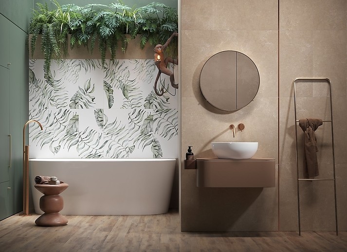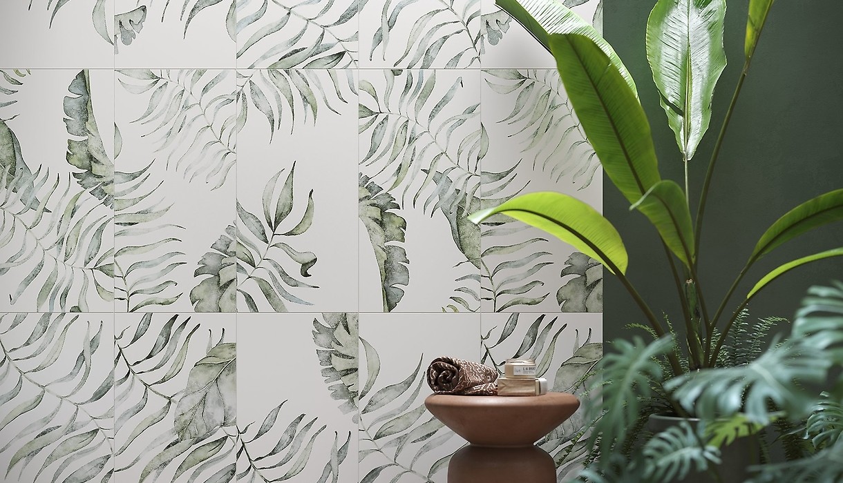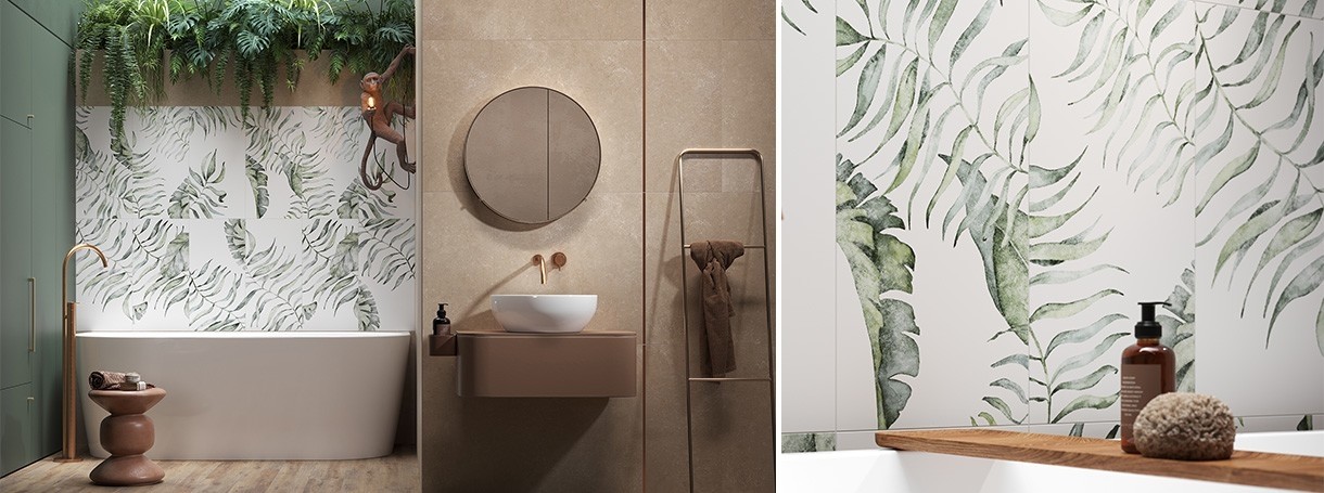 Bliskość natury i możliwość otaczania się jej pięknem daje poczucie szczęścia. To istota kolekcji Motti Leaf. Płytki z motywem dużych zielonych liści nawiązują do trendu botanicznego, który z towarzyszy nam już od kilku sezonów. Płytka dekoracyjna o satynowym wykończeniu z roślinnym rysunkiem, zgrabnie komponuje się z płytkami bazowymi w odcieniach głębokiego beżu oraz bieli. Motywy tropikalne będą efektownych elementem wystroju nowoczesnych łazienek. Znakomicie zaprezentują się w połączeniu z jaśniejszymi tonami zieleni, beżu czy ciepłego taupe oraz akcentami miedzi lub starego złota.