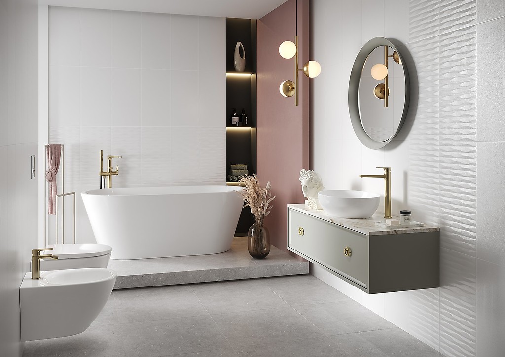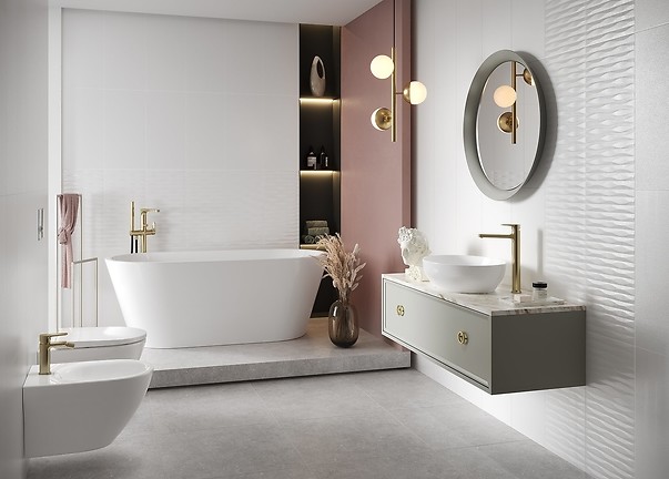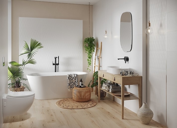 Klasyka nigdy nie wygodzi z mody, a łazienka w bieli to wnętrzarski evergreen. Kolekcja Parmina dodatkowo wykorzystuje efekt geometrycznej, łagodnej struktury. Powierzchnia gładkiej i strukturalnej płytki przypomina szron skrzący się w promieniach słońca. Głównym motywem dekoracyjnym jest natomiast falista struktura, której urok wydobywa światło. Kolekcja efektownie zaprezentuje się w wielu stylizacjach. Wystarczą odpowiednio dobrane dodatki, aby urządzić łazienkę w stylu boho, nadać jej klimat glamour albo pójść w kierunku nowoczesnej estetyki. Jedna płytka w trzech różnych odsłonach – każda inna, każda to gotowy pomysł na wnętrze w ulubionym stylu.