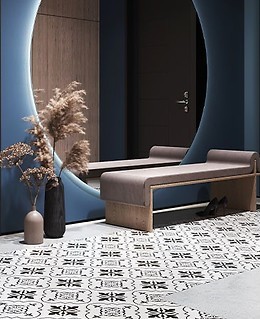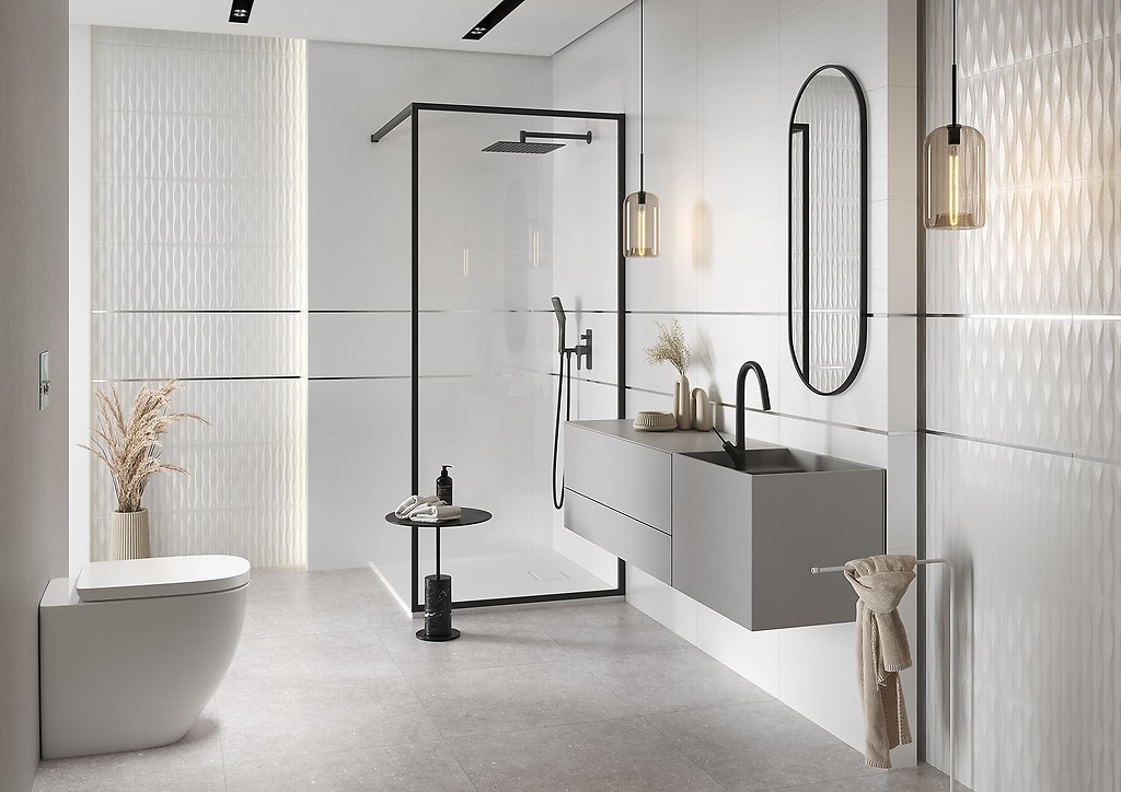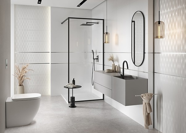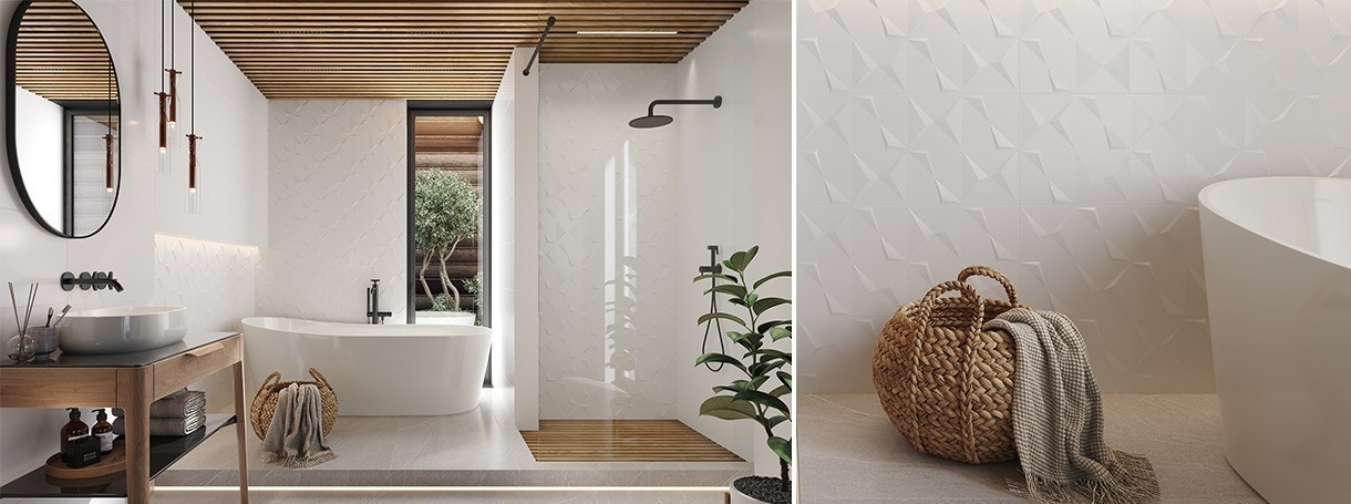 Istotną rolę w kreowaniu klimatu wnętrza odgrywa światło. Głównym motywem dekoracyjnym w kolekcji Velez jest oryginalna struktura o wyrazistym, precyzyjnym kształcie trójkątów, tworzących regularną kompozycję. Uwypuklona poprzez efektowne załamania światła na trójwymiarowej powierzchni staje się wiodącą dekoracją łazienki. Wzornictwo kolekcji otwiera drogę do tworzenie efektownych zestawień zarówno z wyrazistymi akcentami w kolorze matowej czerni, dla zaakcentowania nowoczesnego charakteru aranżacji, ale także naturalnymi materiałami, które dodadzą łazience rustykalnego szyku.