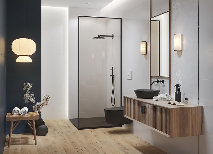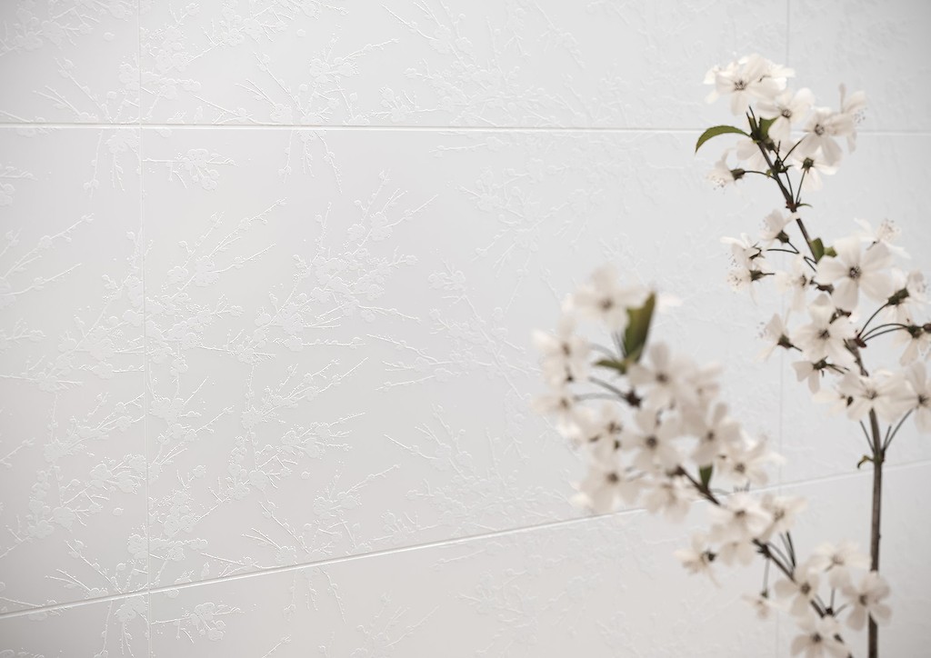 Florystyczne motywy, organiczna delikatność i kontrasty. To wszystko znajdziemy w kolekcji Farisa, dla której inspiracją był japoński symbol wiosny. Gałązka kwitnącej wiśni w postaci strukturalnego wzoru na płytce dekoracyjnej czyni kolekcję niezwykle zmysłową. W jej skład wchodzą także płytki gładkie: biała i granatowa, co sprawia, że urządzając łazienkę możemy realizować naprawdę różnorodne pomysły aranżacyjne. Począwszy od romantycznego wnętrza, jeśli postawimy na subtelne formy i pastelowe dodatki, przez nieco bardziej wyrazisty klimat z przewagą elementów w granatu.