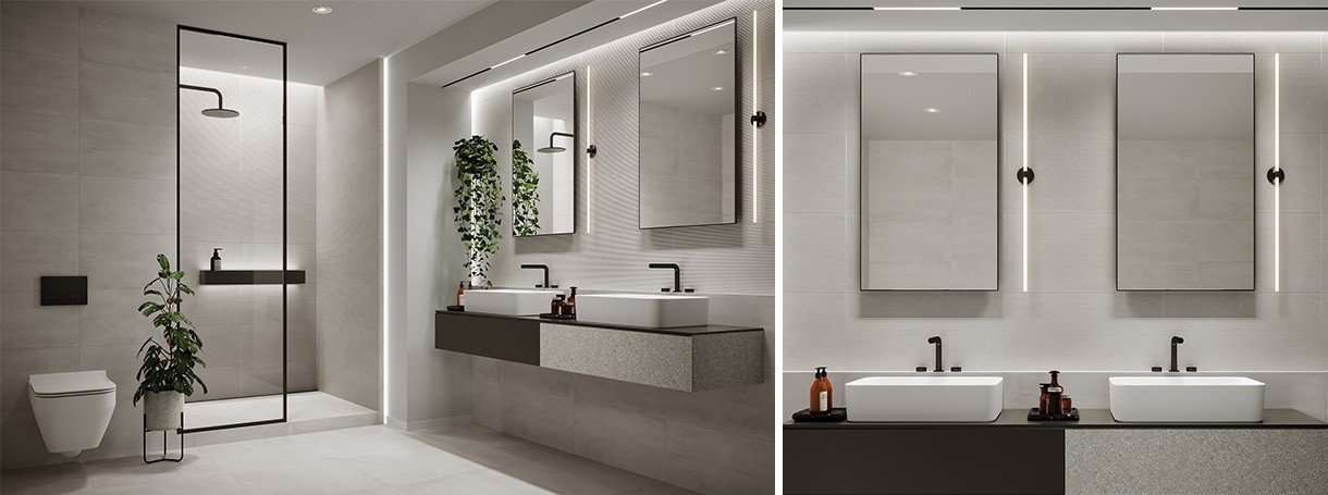 Stawiałam na różnorodność delikatnych wzorów, które stanowiłyby bazę do indywidualnej aranżacji łazienki. Szczególnie polecam kolekcje z linearną strukturą – np. nawiązującą do terazzo Posito czy delikatną Trianę. Jednak moją ulubioną kolekcją jest Tilian, która łączy ze sobą białą płytką o strukturze gęstych pasów z niezwykle ciekawym kamienieniem o różnych tonacjach szarości z której można wyczarować bardzo naturalną, sprzyjającą odpoczynkowi przestrzeń.