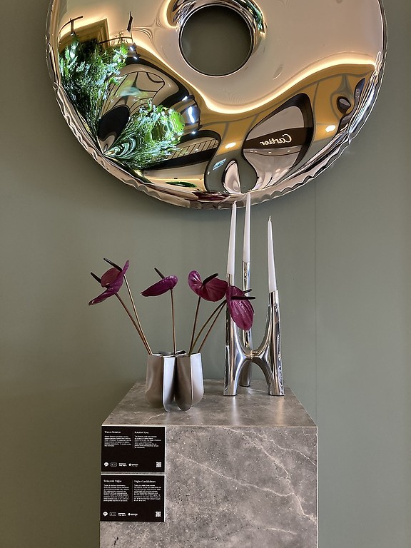 Płyty z rysunkiem kamienia podkreślają piękno wazonów, nie zakłócając ich harmonijnej formy. - To kolejny już raz, gdy możemy być częścią wyjątkowych kreacji Zięta Studio. – mówi Małgorzata Matuzewicz, Brand Marketing Manager Opoczno. - Niezwykle cenimy Oskara Ziętę, jego twórczość i ogromne pokłady kreatywności. Cieszymy się, że zaprosił nas do kolejnego projektu. Dzięki temu nasza kolekcja Silver Point stałą się elementem wystawy, który w subtelny sposób eksponuje niezwykle efektowne realizacje w oryginalnych wnętrzach Hotelu Europejskiego.