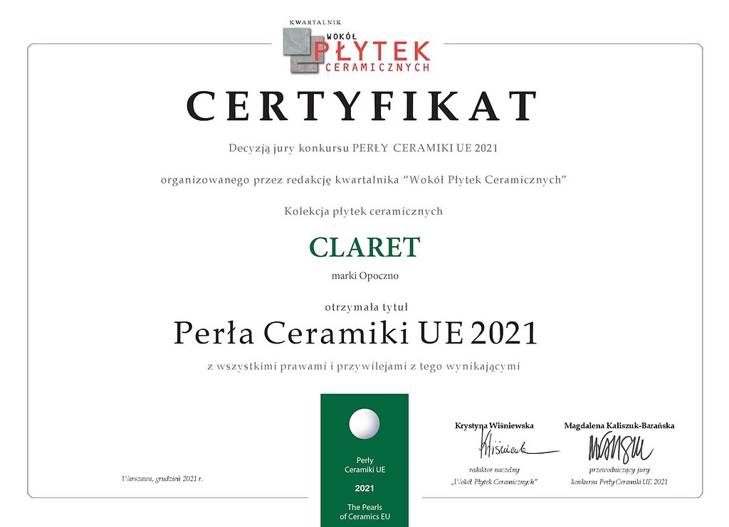 Konkurs PERŁY CERAMIKI UE wyłania wyróżniające się kolekcje płytek ceramicznych. W tym roku kapituła konkursu uhonorowała kolekcję CLARET.