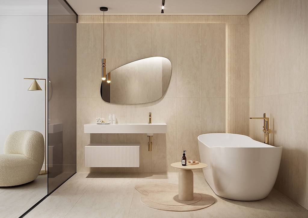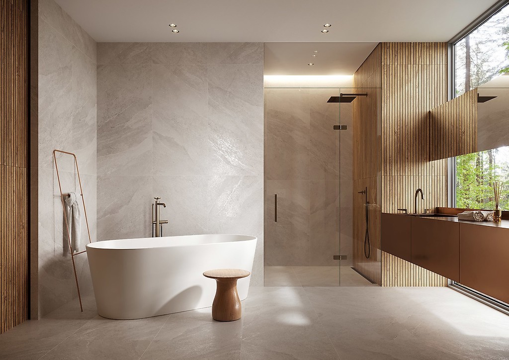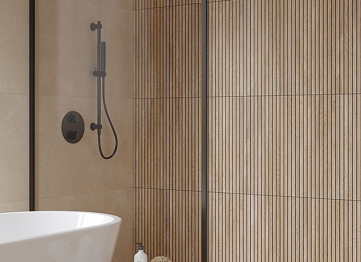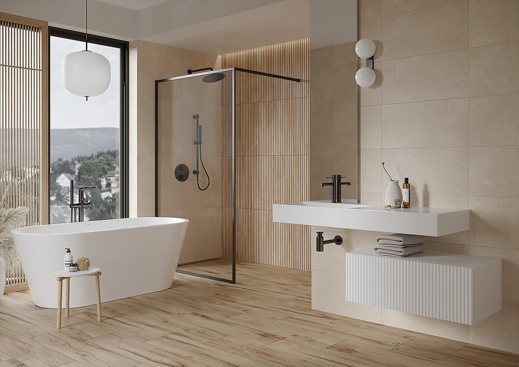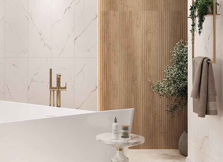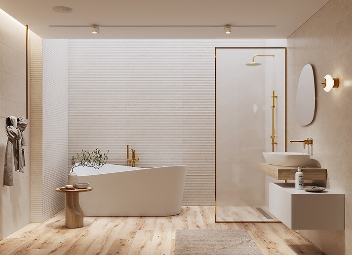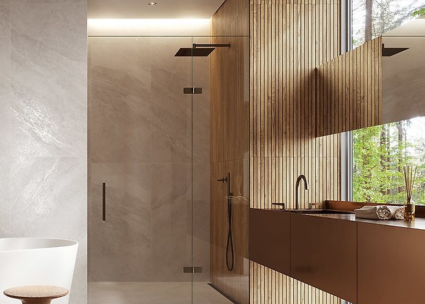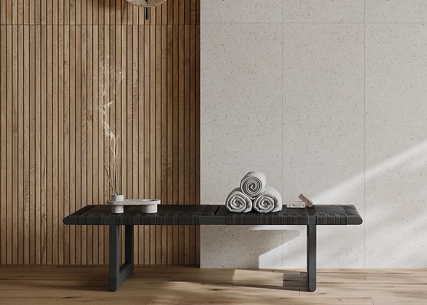 Mono look można łatwo odwrócić, zamieniając jednokolorowe wnętrze w miejsce pełne kontrastów. Płytki do łazienki Aurano w połączeniu z drewnopodobnymi panelami strukturalnymi przekształcą monochromatyczne wnętrze w nowoczesne spa w uspokajającym stylu japandi. Przytulną przestrzeń, w której dominują naturalne materiały – kamień i drewno oraz ciepłe beże i łagodne brązy, uzupełnią żywe rośliny w dekoracyjnych donicach, wnosząc do wnętrza kolor i podkreślając bliskość natury.